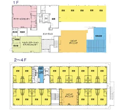| 共用設備 | ロビー、フロント、エレベーター、ナースコール、スタッフルーム、介護浴室、個人用浴室、健康管理・相談室、共用トイレ、厨房室、寝台用エレベーター、応接室、放送設備、更衣室、機械浴室、汚物処理室、洗濯室、玄関ホール、バイク置き場、自販機、花壇、談話室、車椅子用トイレ、避難設備、防災設備、風除室、ダイニングルーム(食堂)、駐車場、駐輪場 |