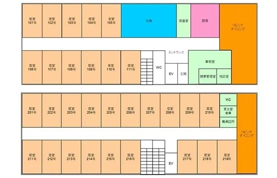 | 共用設備 | ロビー、フロント、エレベーター、ナースコール、スタッフルーム、介護浴室、個人用浴室、健康管理・相談室、共用トイレ、厨房室、寝台用エレベーター、応接室、放送設備、更衣室、機械浴室、汚物処理室、洗濯室、玄関ホール、バイク置き場、自販機、花壇、談話室、車椅子用トイレ、避難設備、防災設備、風除室、ダイニングルーム(食堂)、駐車場、駐輪場 |