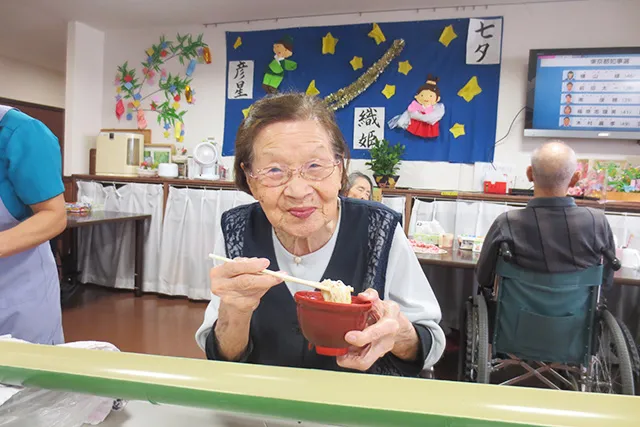 当施設では、心と体にやさしい手作りの食事をご提供しています。旬の食材を取り入れたメニューは、見た目にも楽しく、食べる喜びを感じられるよう工夫されています。 また、季節ごとのイベントでは、流しそうめん、串揚げパーティーや行事食なども実施。みんなで囲む食卓には笑顔があふれ、ご入居者様にとって日々の楽しみのひとつとなっています。温かいお食事と共に、心豊かな時間をお過ごしください。