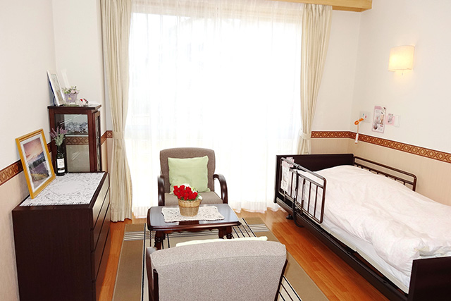 | 居室設備 | ●介護用電動ベッド(寝具付) ●シャワー付トイレ ●エアコン ●クローゼット ●カーテン(レース・ドレープ) ●ナースコール ●車イス対応洗面台 ●スプリンクラー |