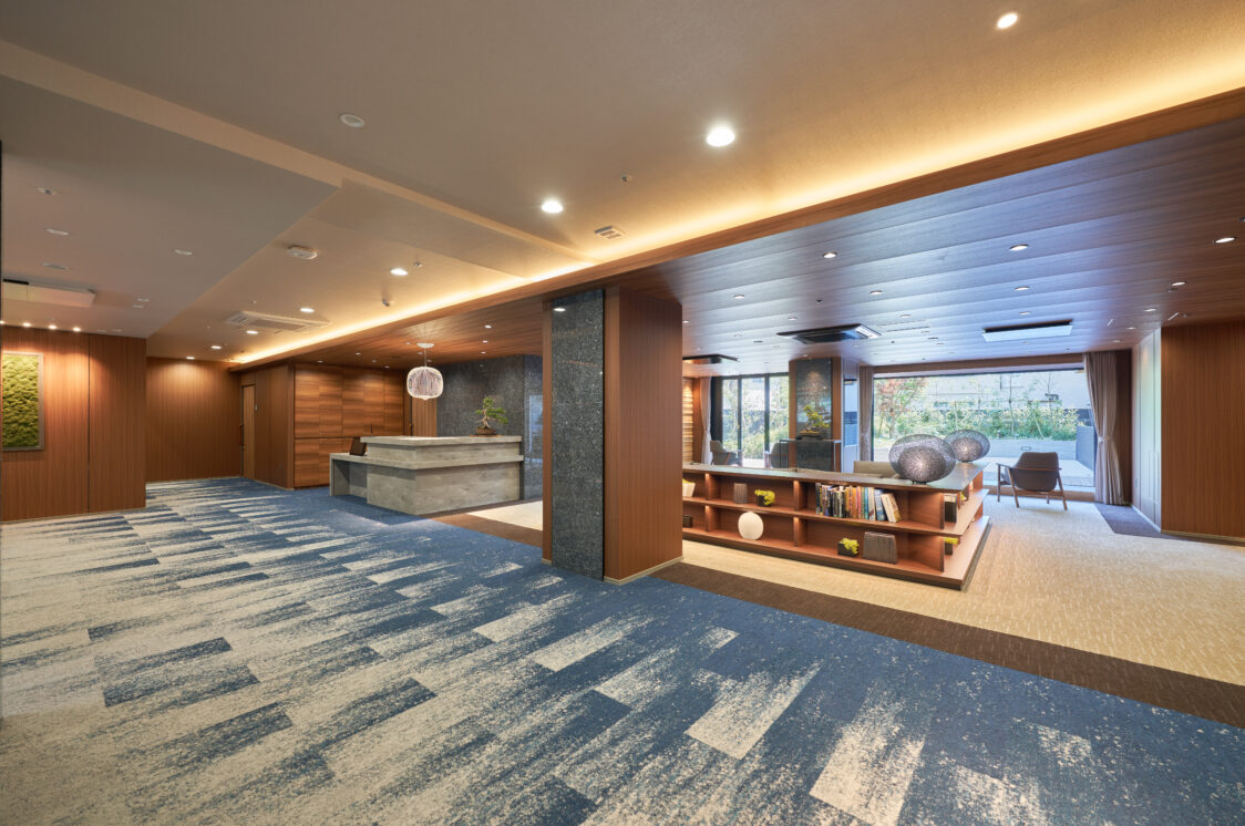 - 158㎡(約100畳)の広々としたエントランスロビー お客様を出迎える広々としたエントランスロビーはアズハイムシリーズ最大級の158㎡(約100畳)。ご家族とゆっくりとくつろげるスペースを多く確保しております。