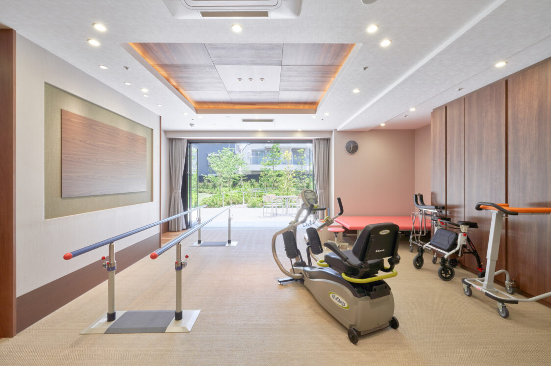 - もっと身近にリハビリを アズハイム品川では、理学療法士(PT)によるリハビリを採用しています。(2024年2月時点) ご入居者の状態に合わたケアプランに従って、その方に合った個別機能訓練を実施しています。 機能訓練スペースは1Fの中庭を望む開放的な場所にあり、歩行訓練スペースでは外気浴をしながら歩行訓練ができます。 「歩きたい」「動きたい」その目標に向かって寄り添い、理学療法士がそれぞれに合った生活リハビリを考え介護スタッフに連携。 ケアスタッフによる生活リハビリの取り組みへとつないでいきます。
