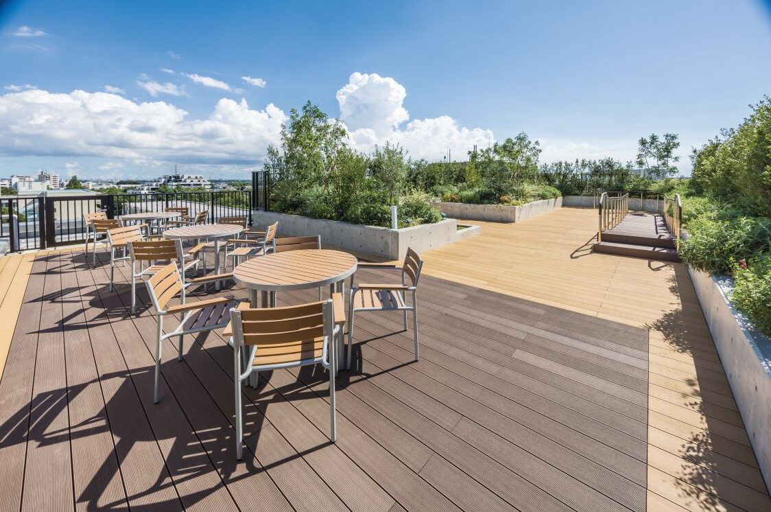 - 見渡しのよい屋上庭園 周辺に高層の建物がないため、遠くまで見渡せ開放感が広がります。歩行訓練スペースや、談話スペース、ガーデニングスペースなどご入居者が思い思いの時間を楽しめる憩いの場です。
