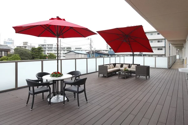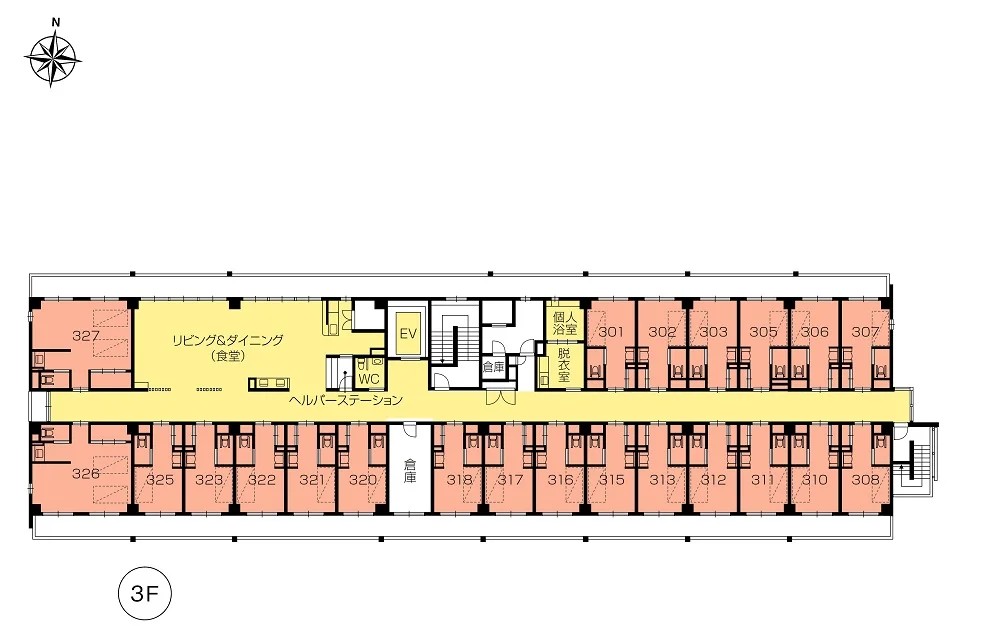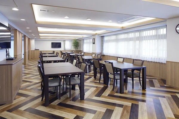 | 共用設備 | エントランスホール、リビング&ダイニング(食堂)※、機能訓練室、個人浴室、特別浴室、ヘルパーステーション、健康管理室、応接室、ファミリールーム、ラウンジ、パソコンコーナー、ヘアーサロン(理美容室)、ランドリー、喫煙室、テラス、駐車場 ※食事だけでなくイベント・レクリエーション等、日常生活上多目的に使用。 |