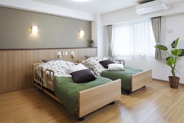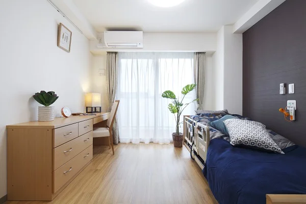 | 居室設備 | 介護用電動ベッド(寝具付)、ナースコール、車いす対応洗面台、温水洗浄機能付トイレ、チェスト、クローゼット、デスク、メモリーボックス、カーテン(レース・ドレープ)、エアコン |