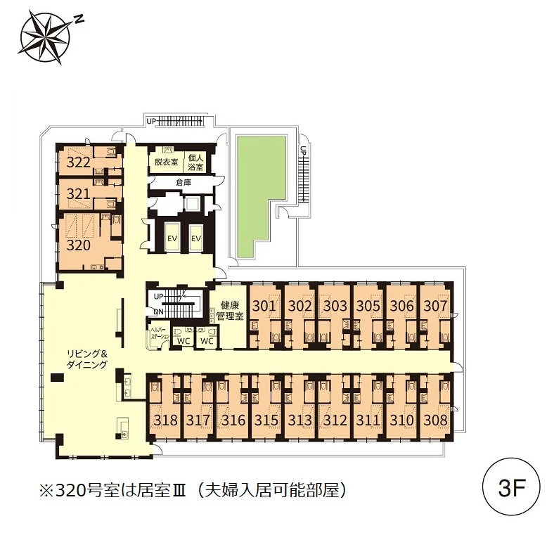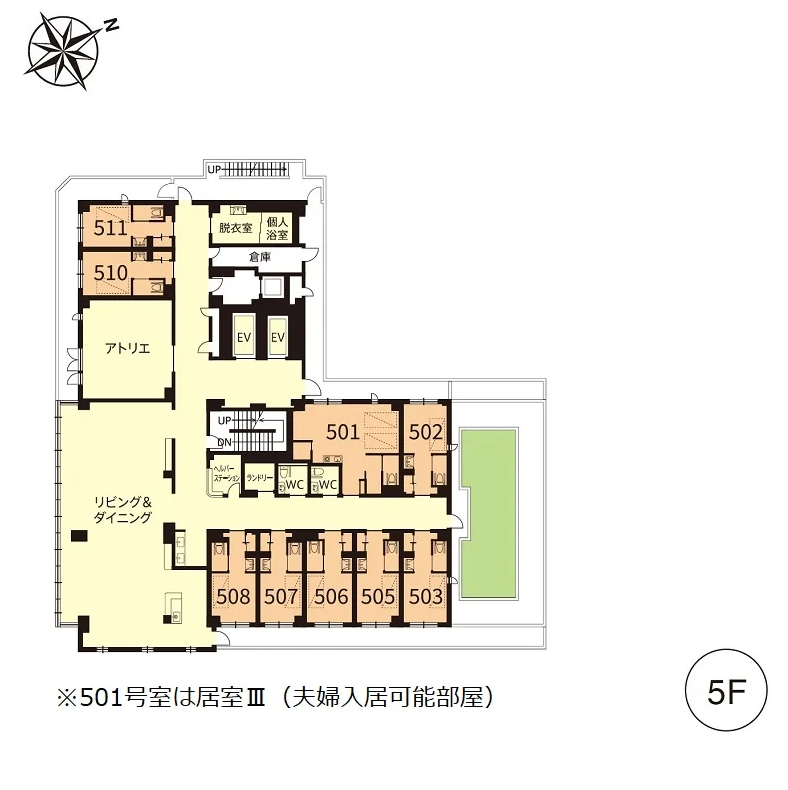 | 共用設備 | エントランスホール、リビング&ダイニング(食堂)、機能訓練室、個人浴室、個人浴室(リフト付き)、特別浴室、ヘルパーステーション、健康管理室、ファミリールーム、アトリエ、ラウンジ、リビング 、ヘアーサロン(理美容室)、応接室、ランドリー、駐車場 |