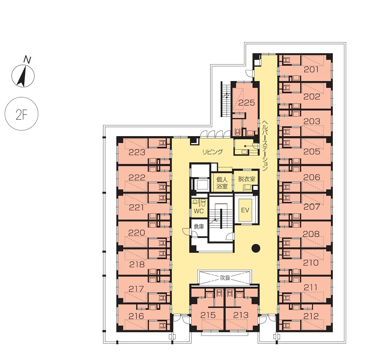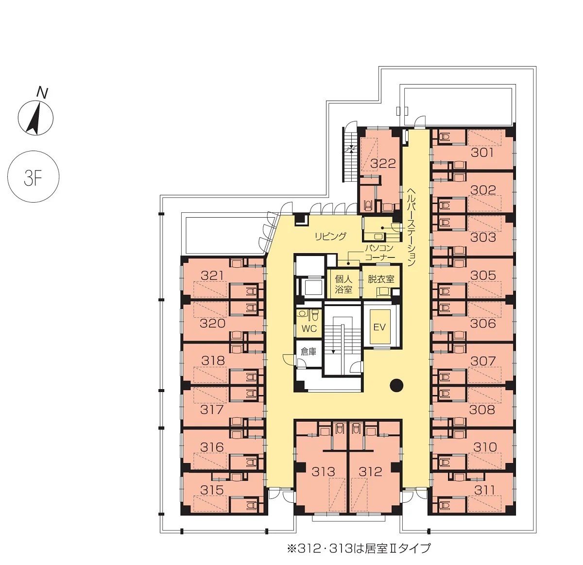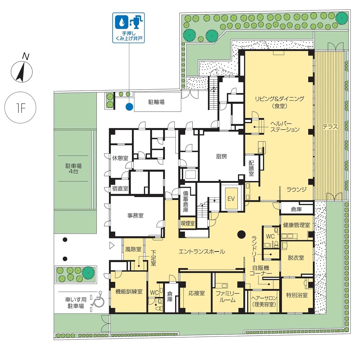| 共用設備 | エントランスホール、リビング&ダイニング(食堂)※、機能訓練室、個人浴室、特別浴室、ヘルパーステーション、健康管理室、応接室、ファミリールーム、リビング、ラウンジ、テラス、ヘアーサロン(理美容室)、ランドリー、喫煙室、駐車場 ※食事だけでなくイベント・レクリエーション等、日常生活上多目的に使用。 |