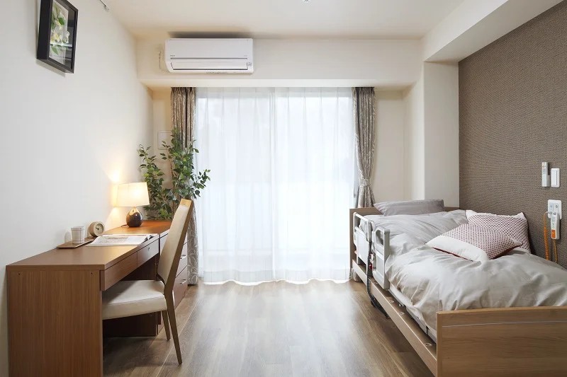 | 居室設備 | 介護用電動ベッド(寝具付)、ナースコール、車いす対応洗面台、温水洗浄機能付トイレ、チェスト、クローゼット、デスク、メモリーボックス、カーテン(レース・ドレープ)、エアコン |