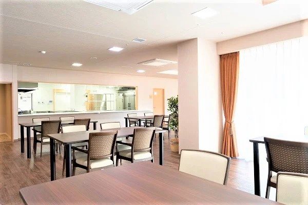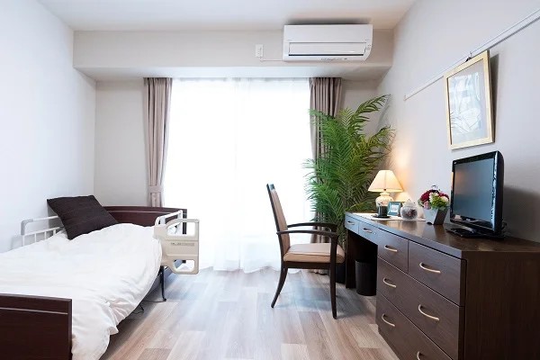 | 居室設備 | 介護用電動ベッド(寝具付)、ナースコール、車いす対応洗面台、温水洗浄機能付トイレ、チェスト、クローゼット、デスク、メモリーボックス、カーテン(レース・ドレープ)、エアコン |