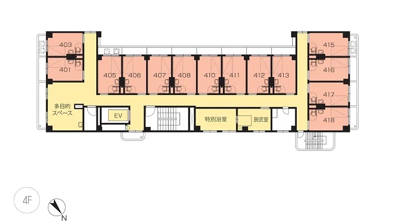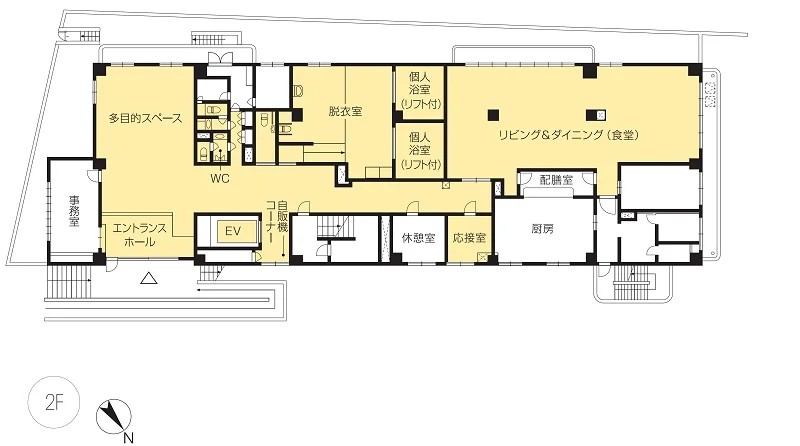 | 共用設備 | エントランスホール、リビング&ダイニング(食堂)※、応接室、健康管理室兼ヘルパーステーション、個人浴室、特別浴室、化粧室、駐車場 ※食事だけでなくイベント・レクリエーション・機能訓練等、日常生活上多目的に使用。 |