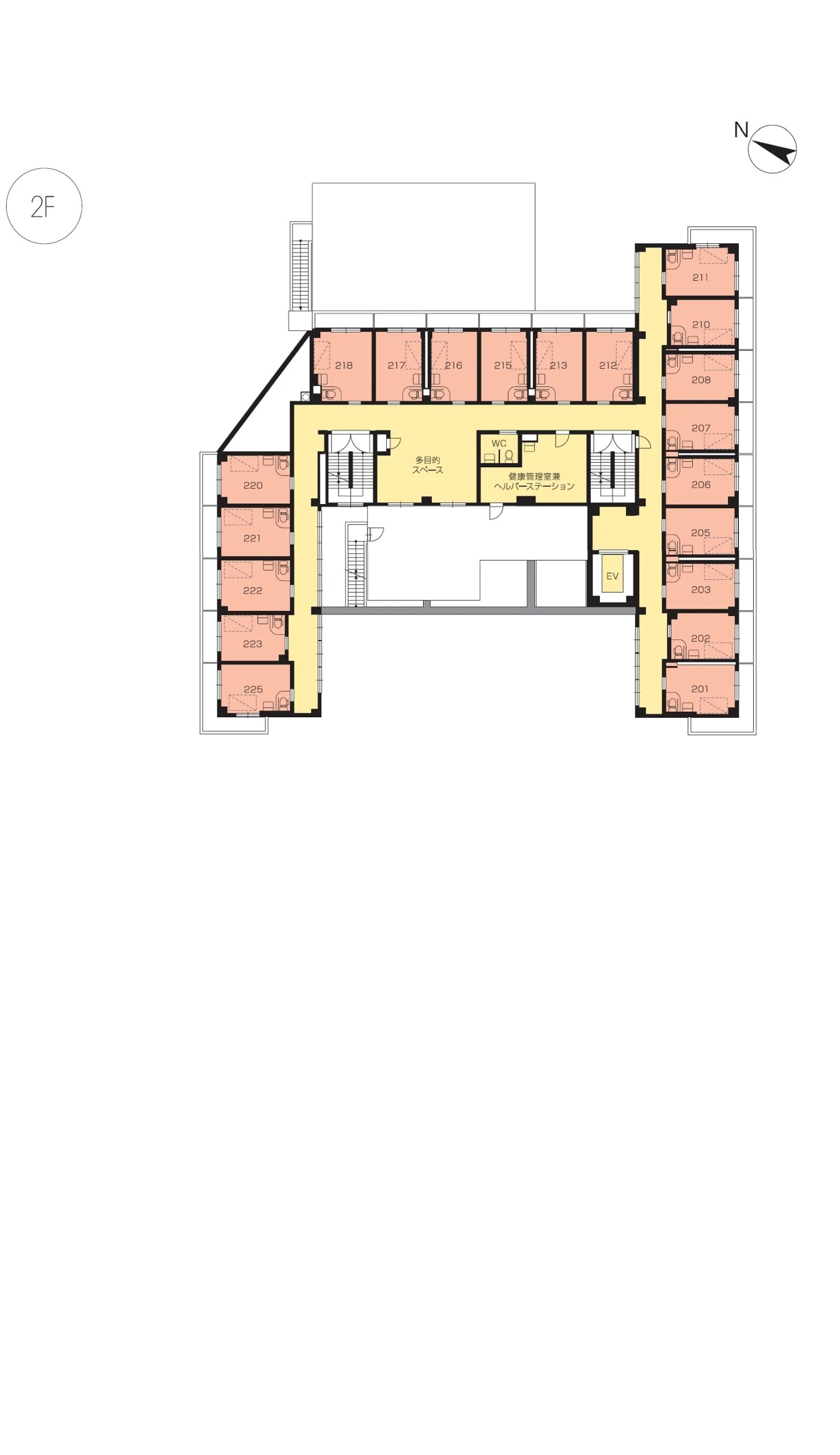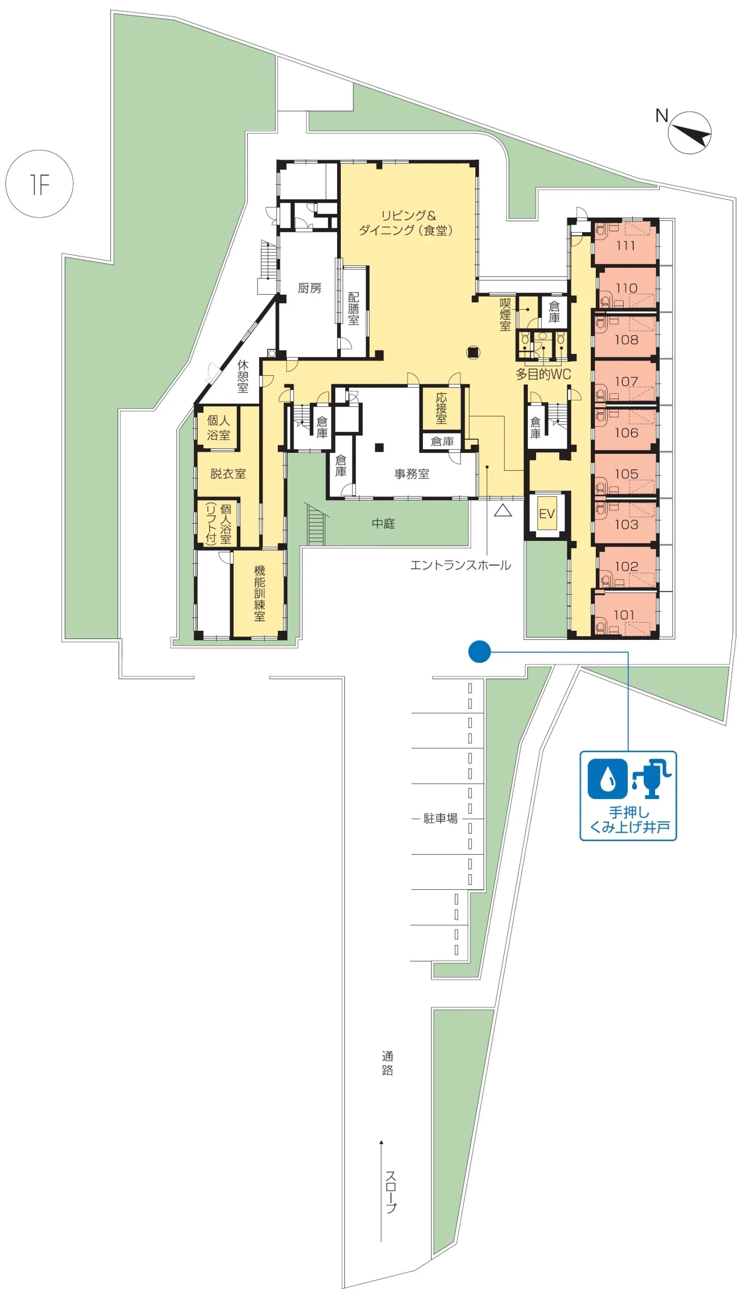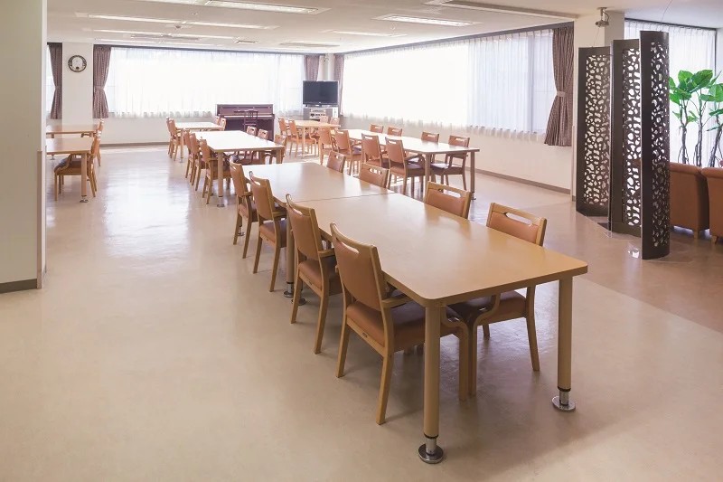 共用設備 | エントランスホール、リビング&ダイニング(食堂)※、機能訓練室、応接室、健康管理室兼ヘルパーステーション、個人浴室、特別浴室、化粧室、駐車場 ※食事だけでなくイベント・レクリエーション・機能訓練等、日常生活上多目的に使用。 |