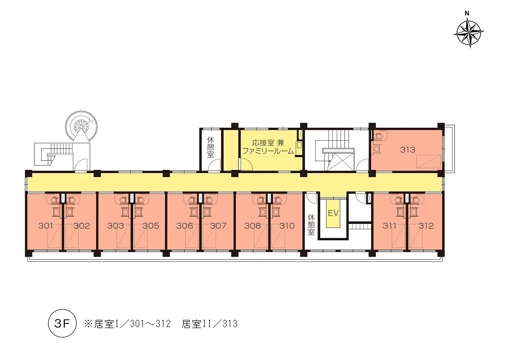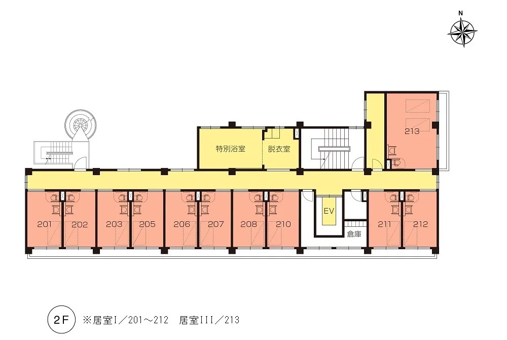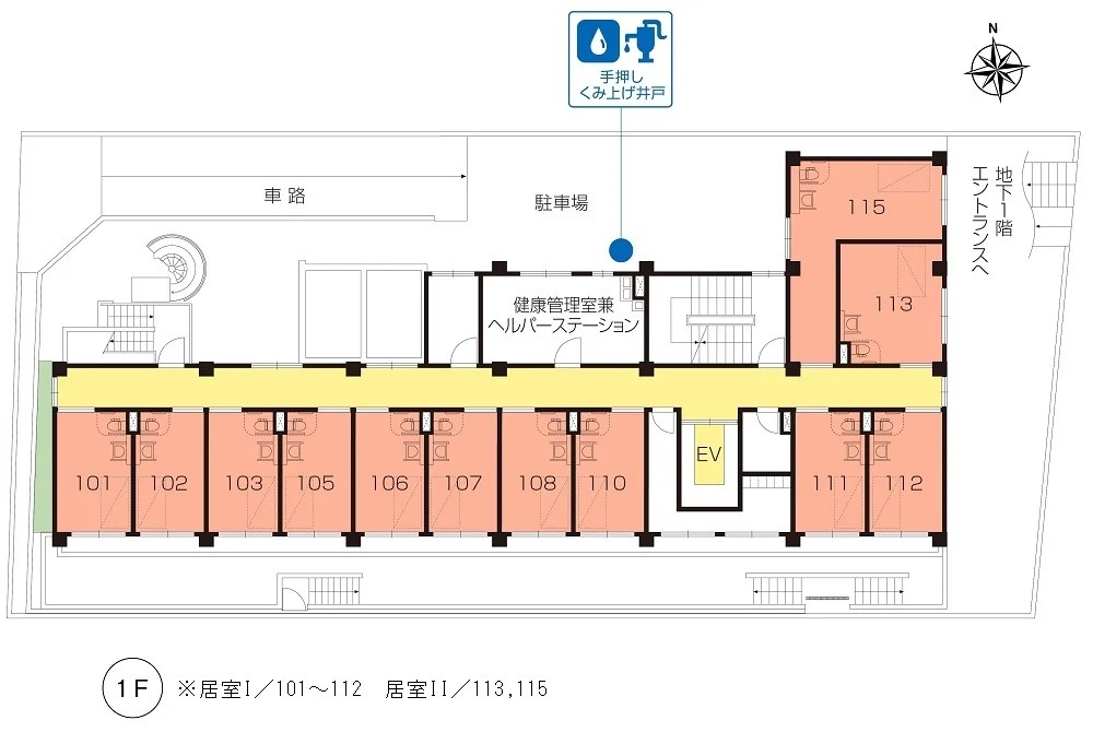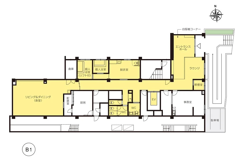 | 共用設備 | エントランスホール、リビング&ダイニング(食堂)※、健康管理室兼ヘルパーステーション、個人浴室、特別浴室、応接室兼ファミリールーム、ラウンジ、化粧室、駐車場 ※食事だけでなくイベント・レクリエーション・機能訓練等、日常生活上多目的に使用。 |