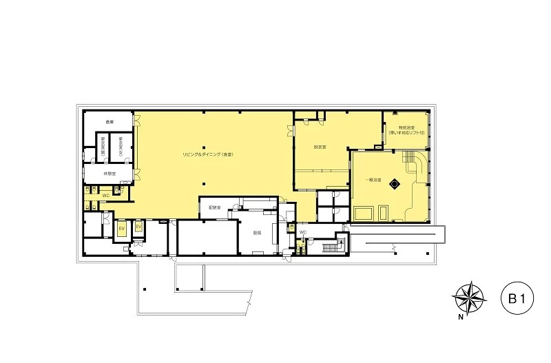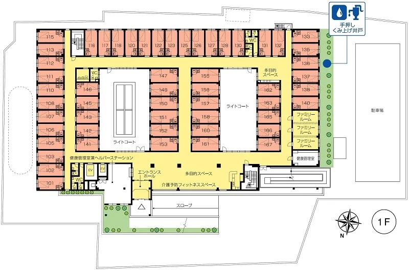 | 共用設備 | エントランスホール、リビング&ダイニング(食堂)※、ファミリールーム、介護予防フィットネススペース、健康管理室兼ヘルパーステーション、一般浴室(車いす対応リフト付)、特別浴室、個人浴室、ライトコート、ランドリー、化粧室、駐車場 ※食事だけでなくイベント・レクリエーション・機能訓練等、日常生活上多目的に使用。 |