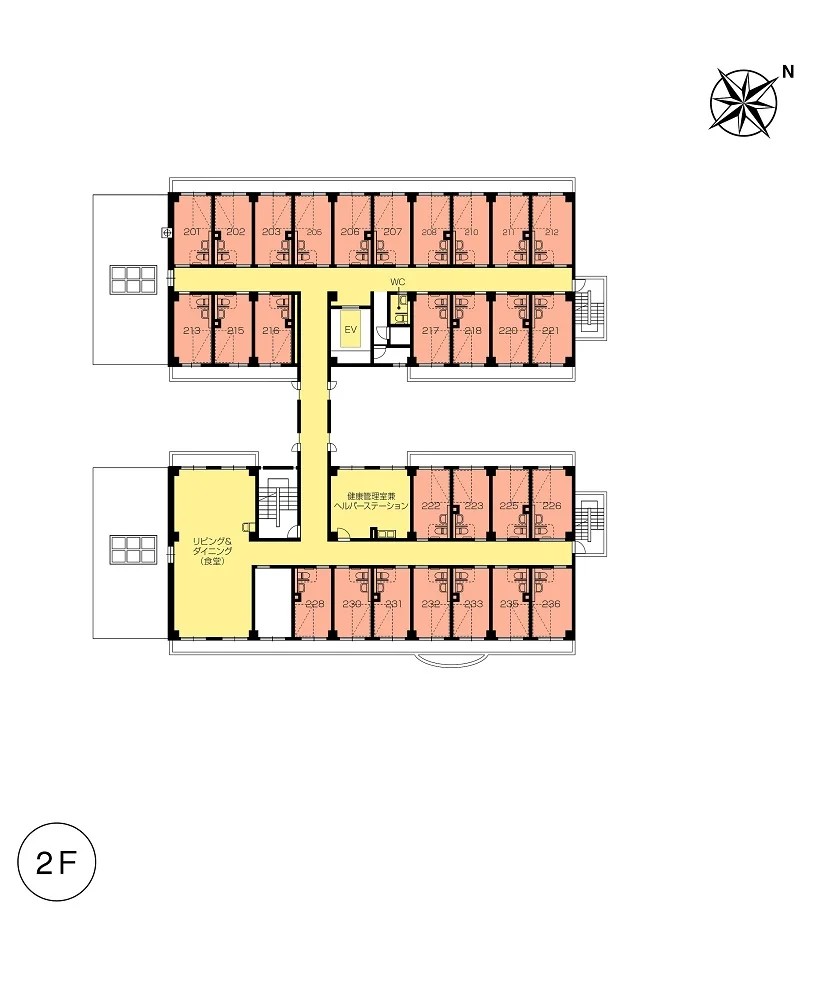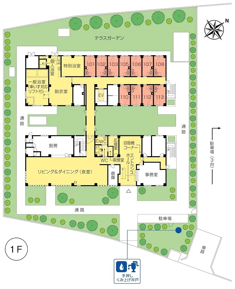 共用設備 | エントランスホール、リビング&ダイニング(食堂)※、応接室、健康管理室兼ヘルパーステーション、一般浴室(車いす対応リフト付)、特別浴室、個人浴室、化粧室、テラスガーデン、駐車場 ※食事だけでなくイベント・レクリエーション・機能訓練等、日常生活上多目的に使用。 |