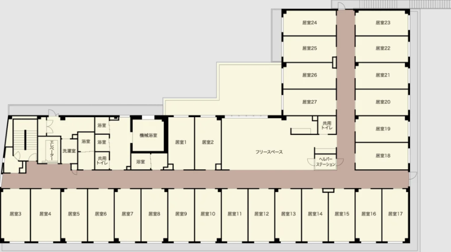 | 共用設備 | エントランスラウンジ、応接室、共有トイレ、浴室・脱衣室(機械浴室)、ダイニング(キッチン含む) |