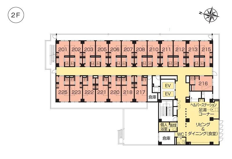 | 共用設備 | エントランスホール、リビング&ダイニング(食堂)、地域交流スペース兼機能訓練室、個人浴室、特別浴室、ヘルパーステーション、健康管理室、応接室兼ファミリールーム、ラウンジ、ヘアーサロン(理美容室)、ランドリー、ルーフデッキ、駐車場 |