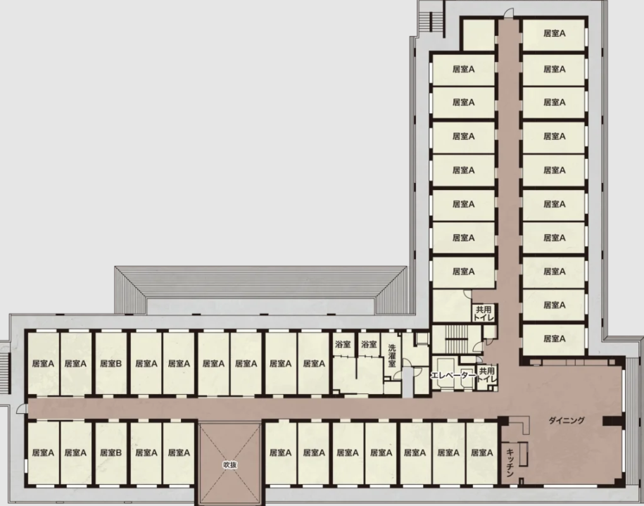 | 共用設備 | 浴室・脱衣室(機械浴室)、ダイニング(キッチン含む)、共用トイレ、 洗濯室、ラウンジ、カフェコーナー |
