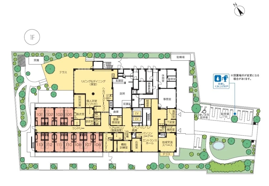 共用設備 | エントランスホール、リビング&ダイニング(食堂)、機能訓練室 、個人浴室、特別浴室、ヘルパーステーション、健康管理室、応接室、ファミリールーム、地域交流スペース、パソコンコーナー、リビング、ラウンジ、ヘアーサロン(理美容室)、ランドリー、喫煙室、テラス、駐車場 |