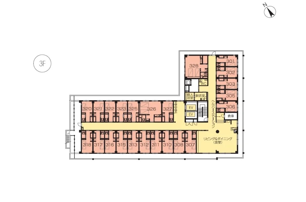 | 共用設備 | エントランスホール、リビング&ダイニング(食堂)、機能訓練室 、個人浴室、特別浴室、ヘルパーステーション、健康管理室、応接室、ファミリールーム、地域交流スペース、パソコンコーナー、リビング、ラウンジ、ヘアーサロン(理美容室)、ランドリー、喫煙室、テラス、駐車場 |