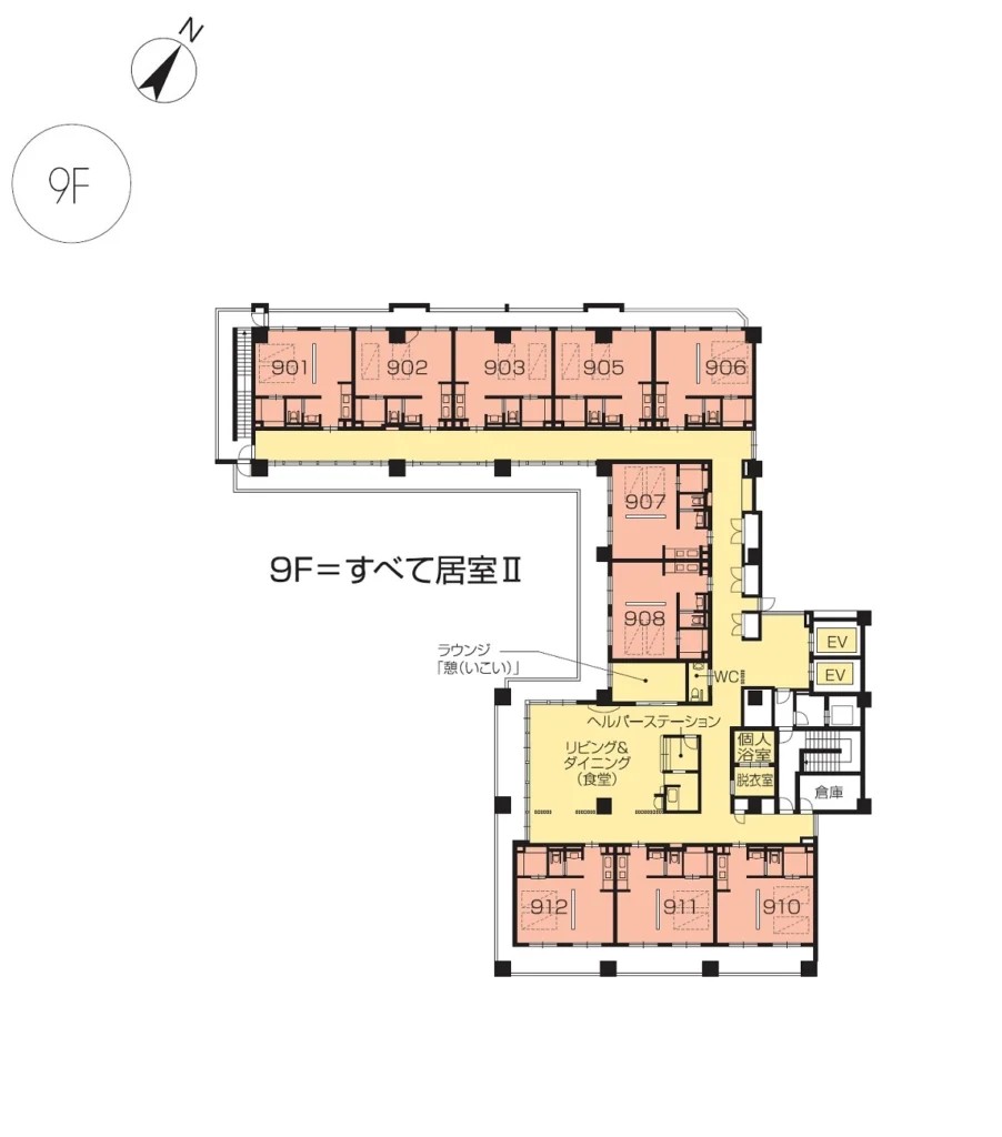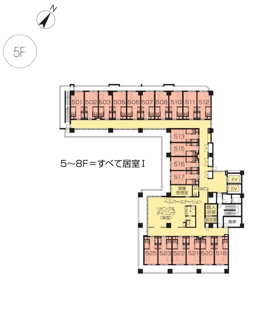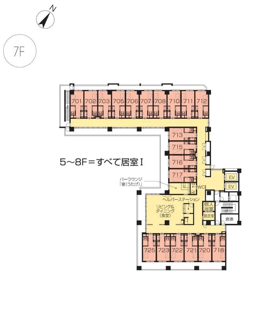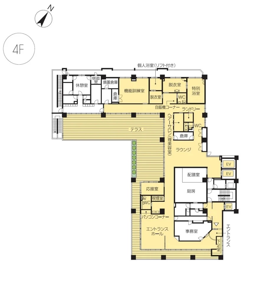 | 共用設備 | エントランスホール、リビング&ダイニング(食堂)、機能訓練室、個人浴室、特別浴室、ヘルパーステーション、健康管理室、応接室、多目的ルーム、ラウンジ、テラス、ヘアーサロン(理美容室)、ランドリー、喫煙室、駐車場 |