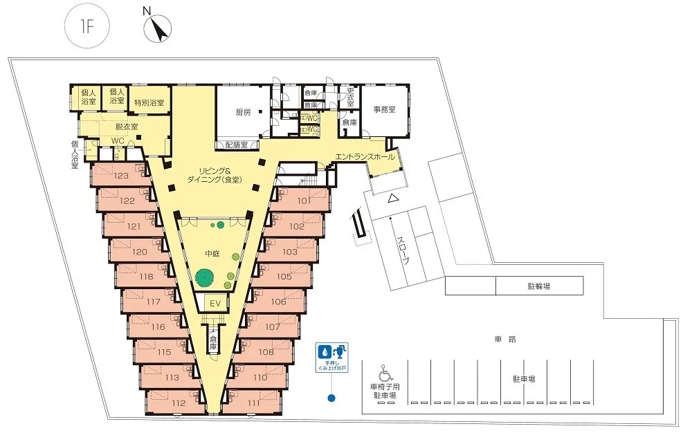 | 共用設備 | エントランスホール、リビング&ダイニング(食堂)※、応接室、健康管理室兼ヘルパーステーション、応接室、特別浴室、個人浴室、テラスガーデン、化粧室、駐車場 ※食事だけでなくイベント・レクリエーション・機能訓練等、日常生活上多目的に使用。 |