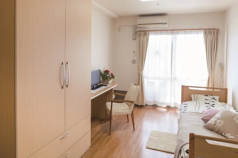 | 居室設備 | 介護用電動ベッド(寝具付)、ナースコール、車いす対応洗面台、暖房便座機能付トイレ、クローゼット、カウンターデスク、カーテン(レース・ドレープ)、エアコン |