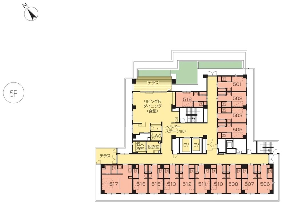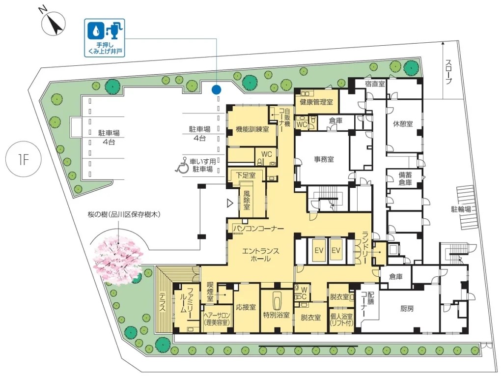 | 共用設備 | エントランスホール、リビング&ダイニング(食堂)、機能訓練室、個人浴室、特別浴室、ヘルパーステーション、健康管理室、応接室、ファミリールーム、多目的ルーム、パソコンコーナー、テラス、ヘアーサロン(理美容室)、ランドリー、喫煙室、駐車場 |