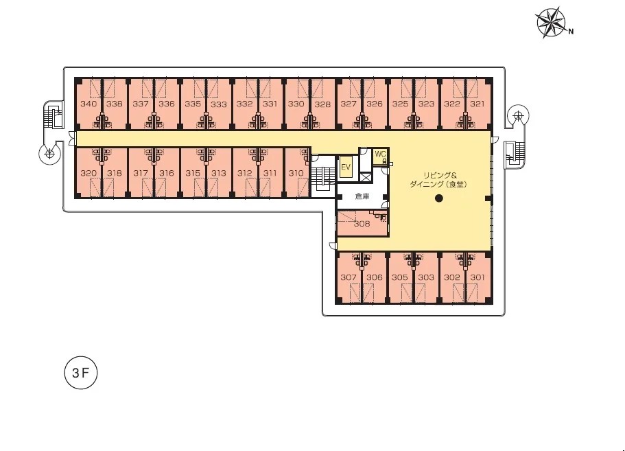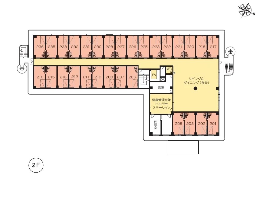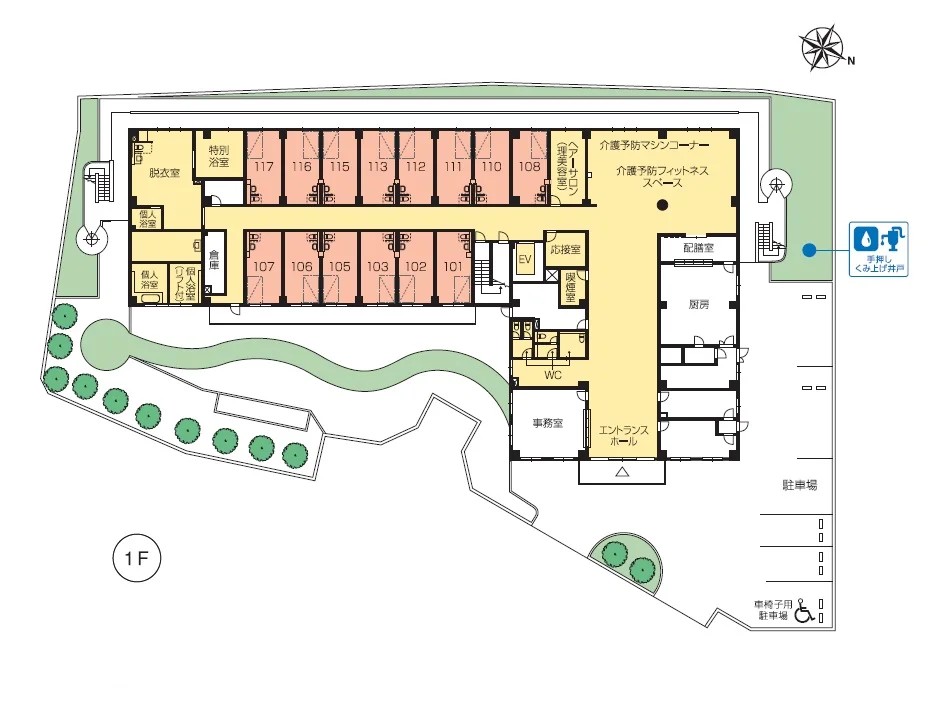 | 共用設備 | エントランスホール、リビング&ダイニング(食堂)※、介護予防フィットネススペース、応接室、健康管理室兼ヘルパーステーション、個人浴室、特別浴室、遊歩道、化粧室、ヘアーサロン(理美容室)、喫煙室、駐車場 ※食事だけでなくイベント・レクリエーション・機能訓練等、日常生活上多目的に使用。 |