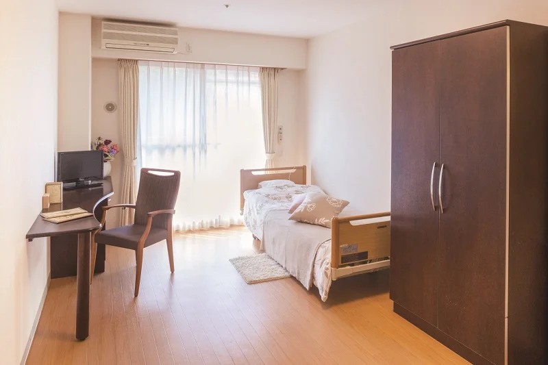 | 居室設備 | 介護用電動ベッド(寝具付)、ナースコール、車いす対応洗面台、暖房便座機能付トイレ、クローゼット、カウンターデスク、カーテン(レース・ドレープ)、エアコン |