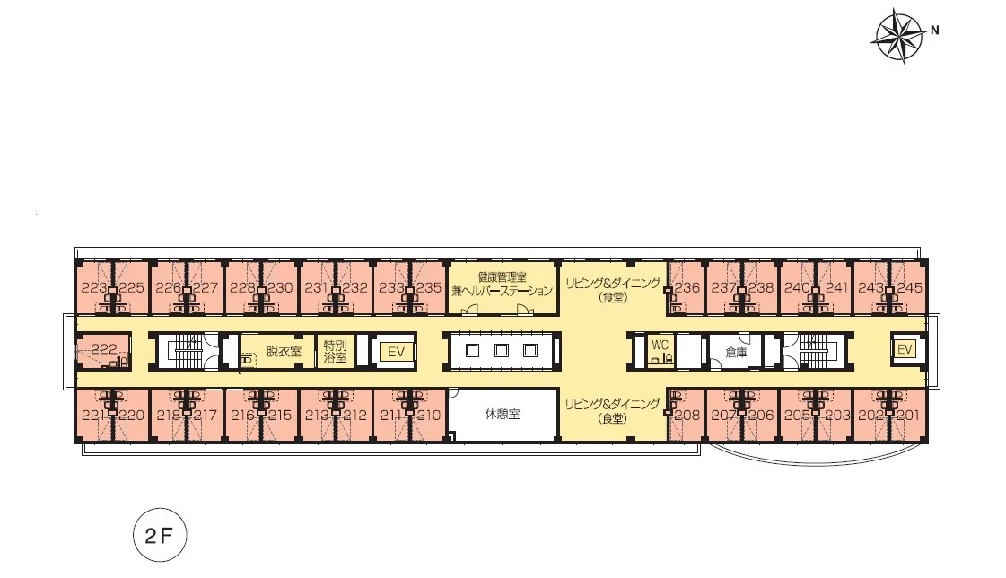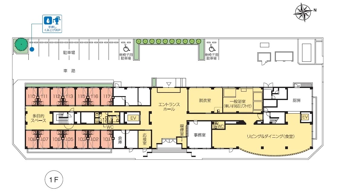 | 共用設備 | エントランスホール、リビング&ダイニング(食堂)※、応接室、健康管理室兼ヘルパーステーション、一般浴室(車いす対応リフト付)、特別浴室、個人浴室、ランドリー、化粧室、喫煙室、駐車場 ※食事だけでなくイベント・レクリエーション・機能訓練等、日常生活上多目的に使用。 |