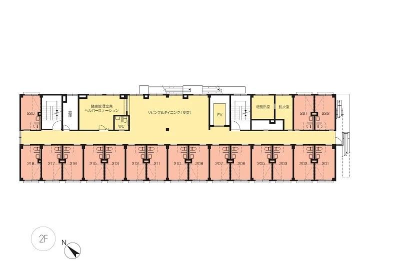 | 共用設備 | エントランスホール、リビング&ダイニング(食堂)※、応接室、健康管理室兼ヘルパーステーション、一般浴室(車いす対応リフト付)、特別浴室、個人浴室、ランドリー、化粧室、駐車場 ※食事だけでなくイベント・レクリエーション・機能訓練等、日常生活上多目的に使用。 |