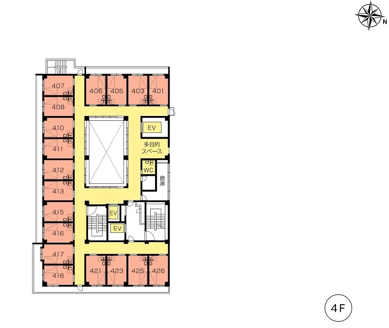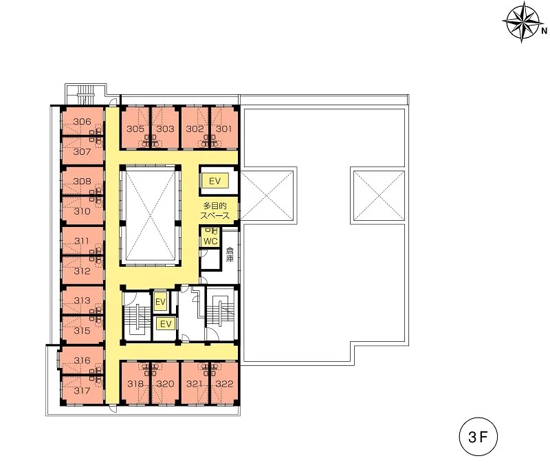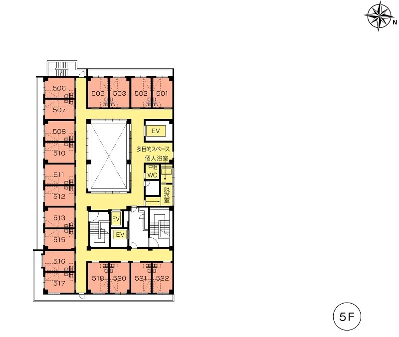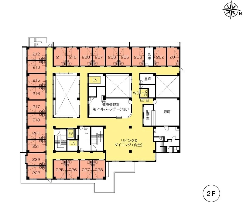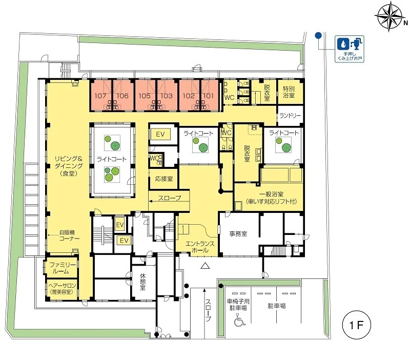 | 共用設備 | エントランスホール、リビング&ダイニング(食堂)※、応接室、ファミリールーム、健康管理室兼ヘルパーステーション、機能訓練室、一般浴室(車いす対応リフト付)、特別浴室、個人浴室、ライトコート、ランドリー、ヘアーサロン(理美容室)、化粧室、駐車場 ※食事だけでなくイベント・レクリエーション・機能訓練等、日常生活上多目的に使用。 |