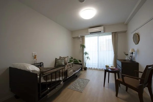 | 居室設備 | 介護用電動ベッド(寝具付)、ナースコール、車いす対応洗面台、温水洗浄機能付トイレ、クローゼット、メモリーボックス、シューズボックス(一部設置されていない居室があります)、カーテン(レース・ドレープ)、エアコン |