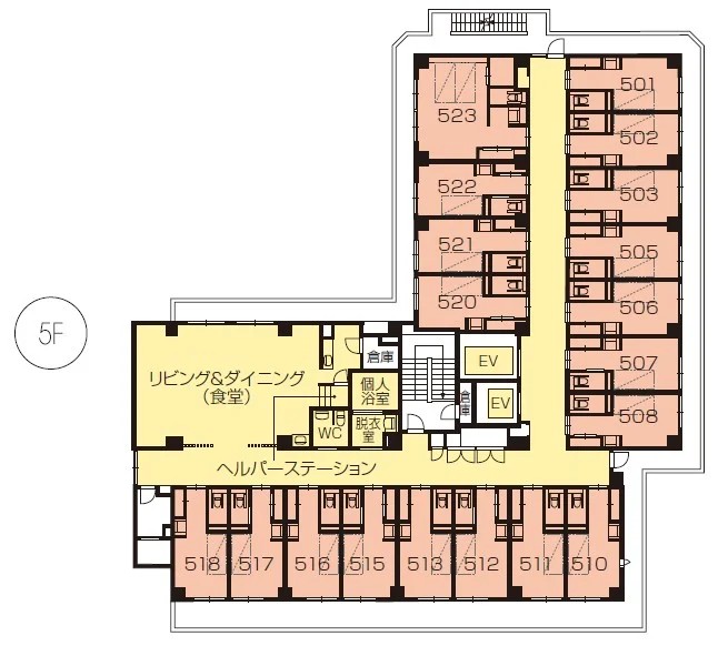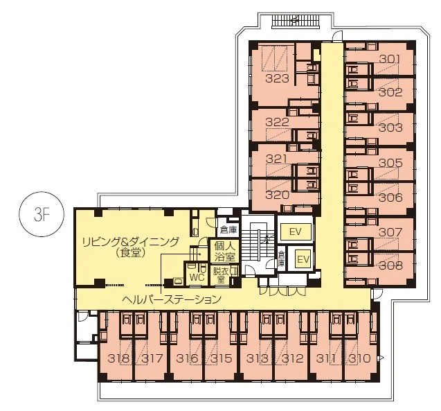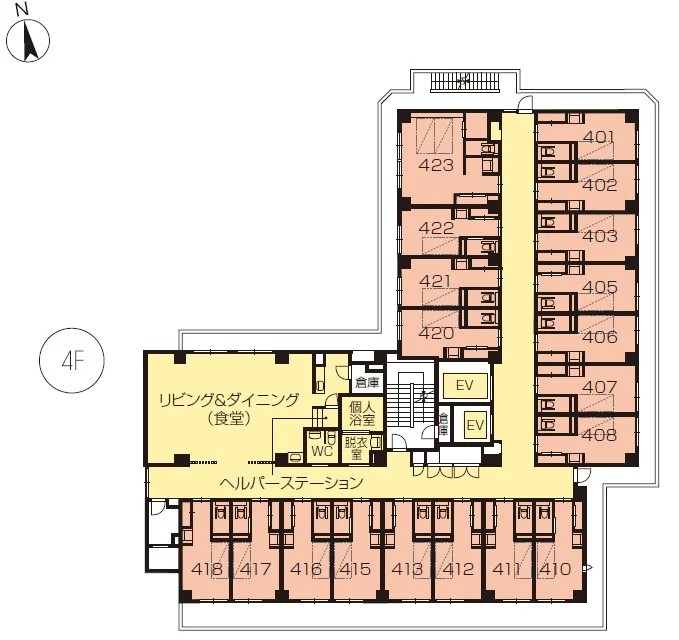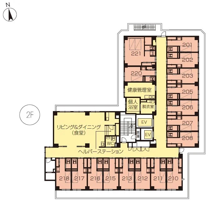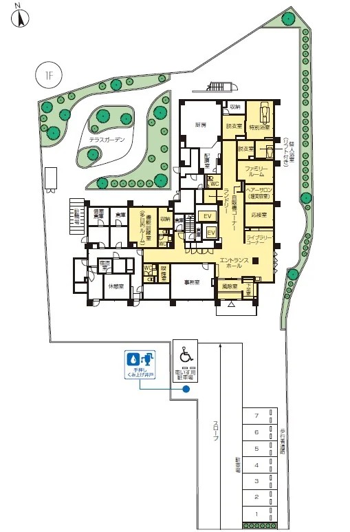 | 共用設備 | エントランスホール、リビング&ダイニング(食堂)、機能訓練室、個人浴室、特別浴室、ヘルパーステーション、健康管理室、応接室、ファミリールーム、パソコンコーナー、ヘアーサロン(理美容室)、ランドリー、喫煙室、駐車場 |