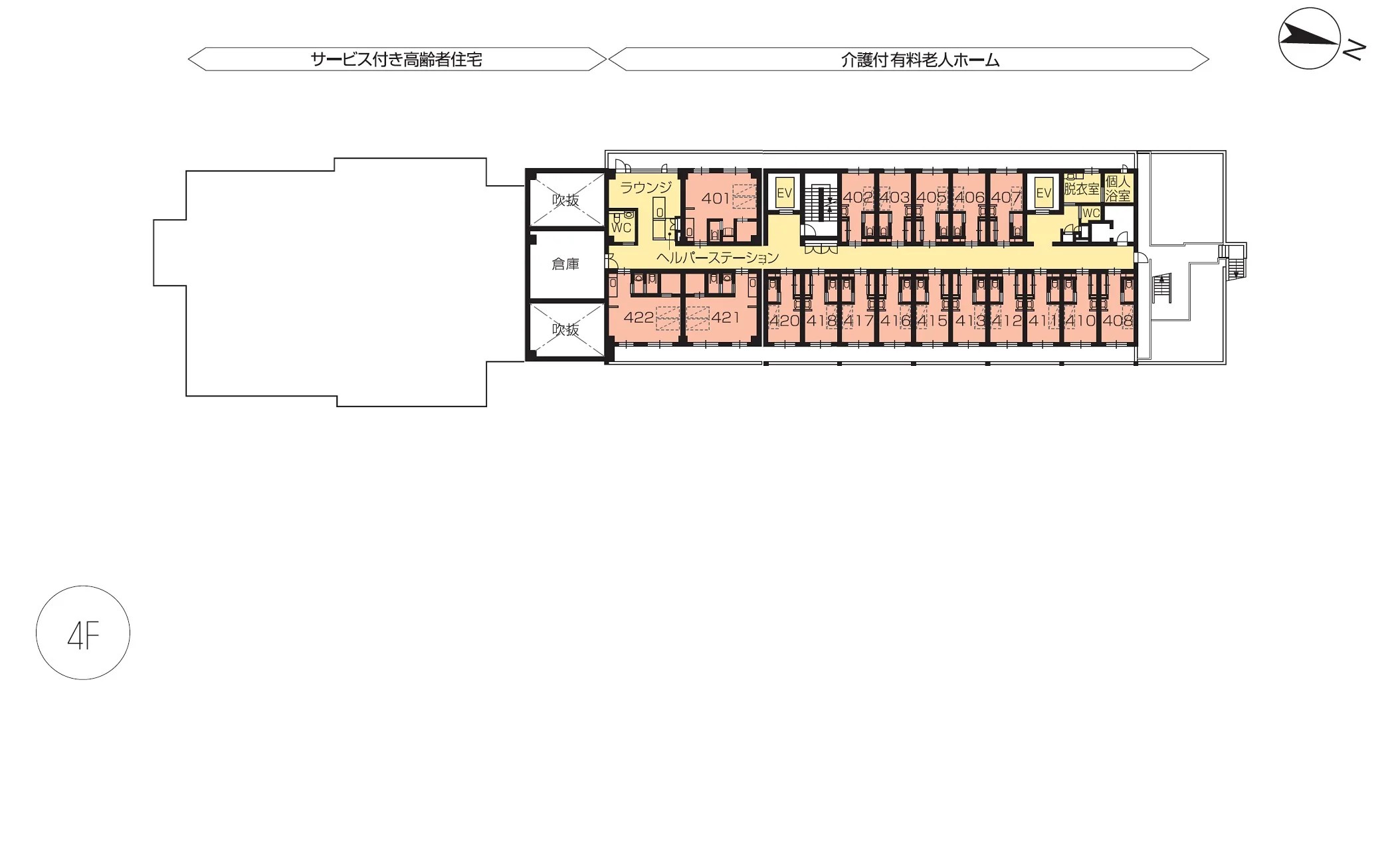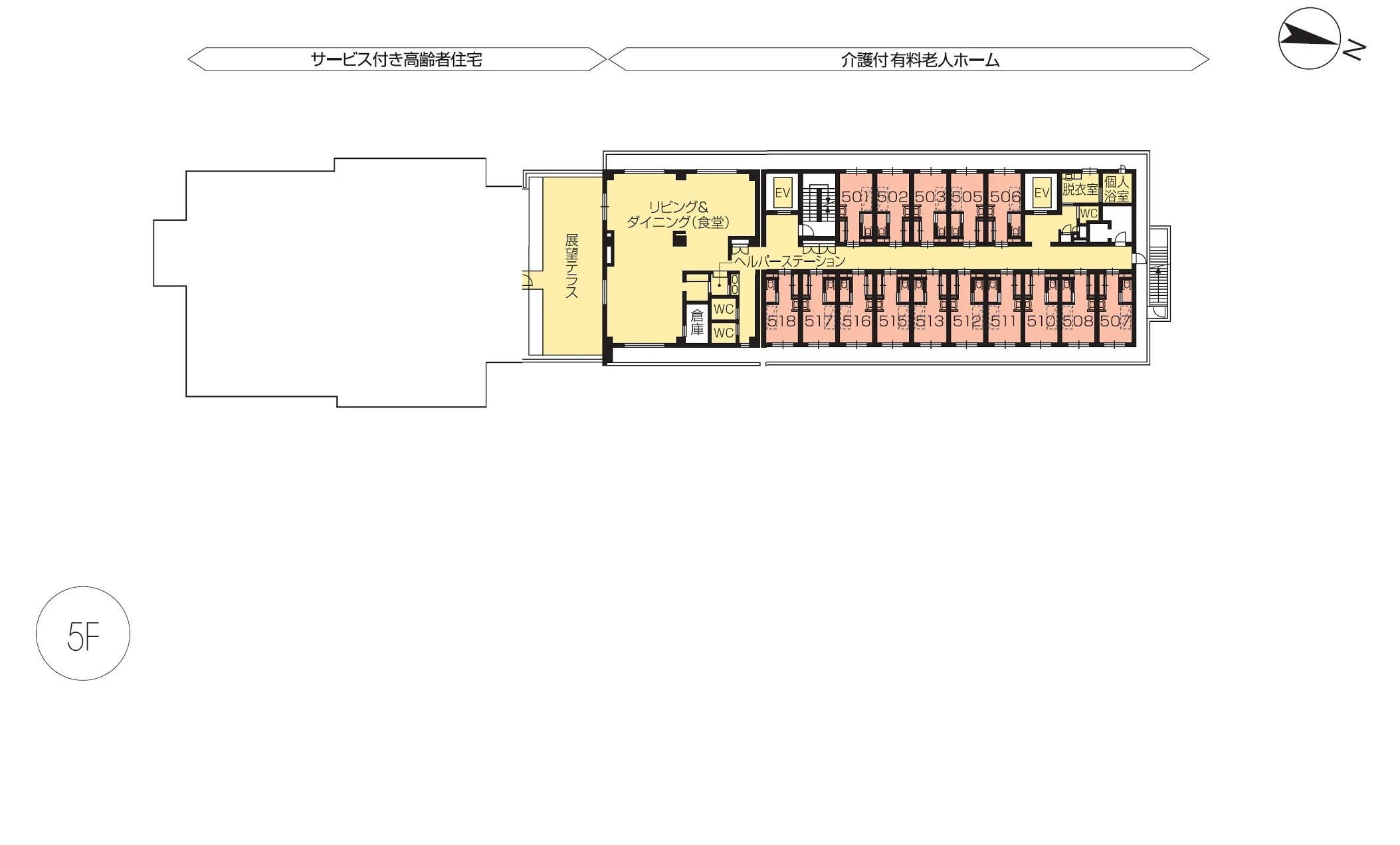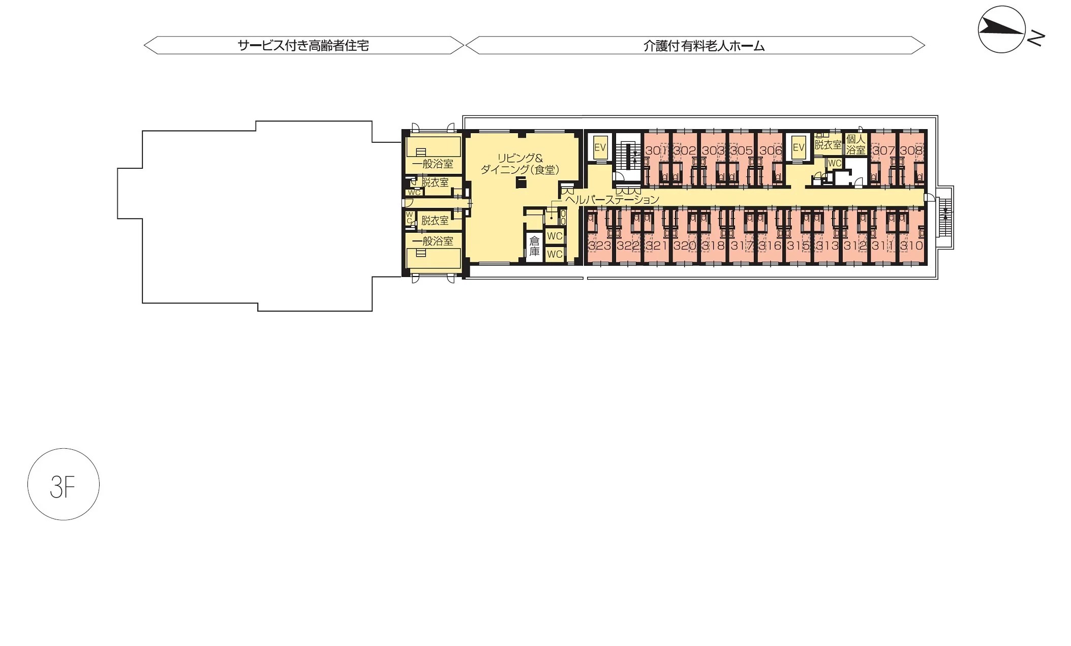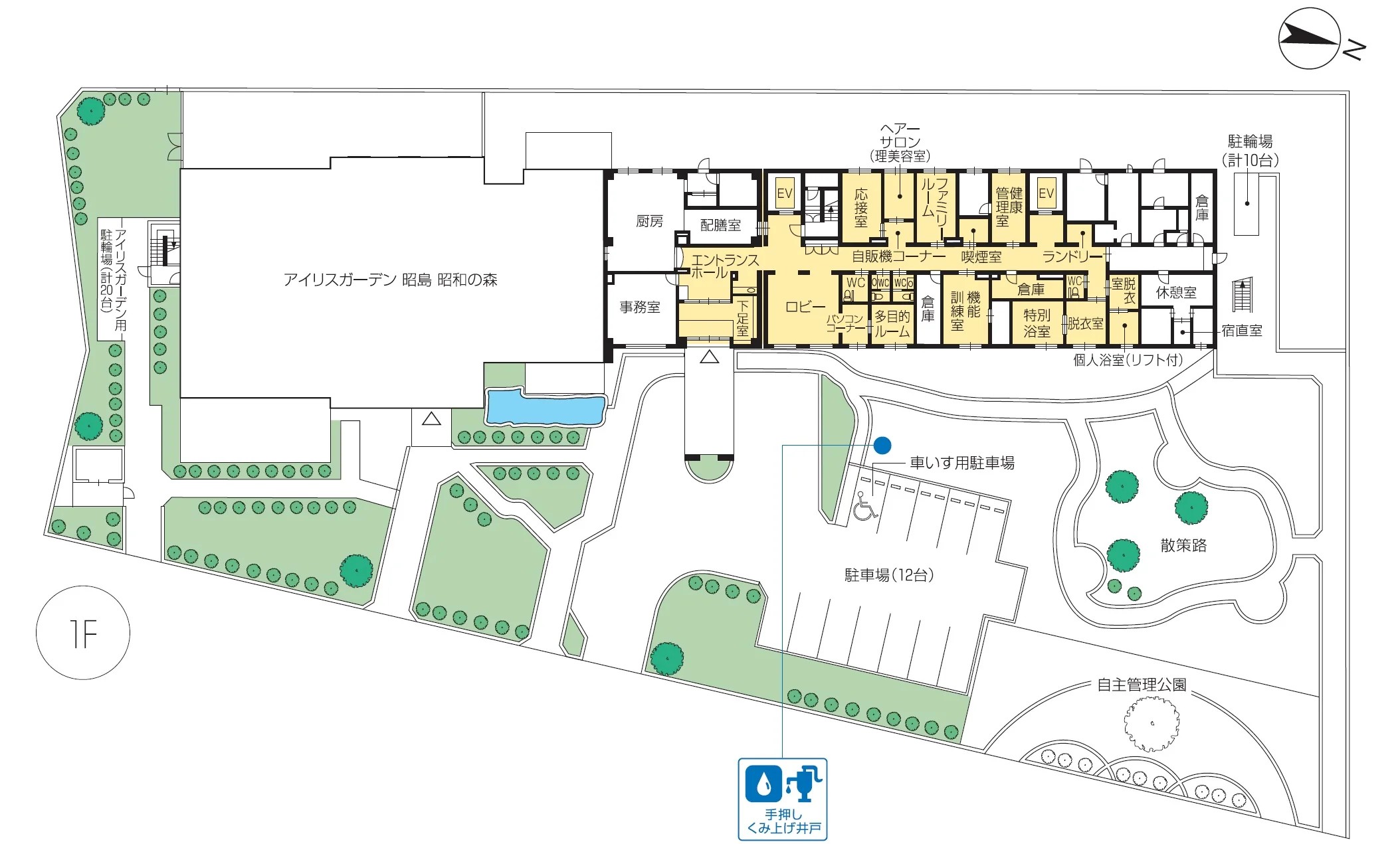 | 共用設備 | エントランスホール、リビング&ダイニング(食堂)、機能訓練室、一般浴室、個人浴室、特別浴室、ヘルパーステーション、健康管理室、応接室、ファミリールーム、パソコンコーナー、多目的ルーム、展望テラス※、ヘアーサロン(理美容室)、ランドリー、喫煙室、駐車場 |