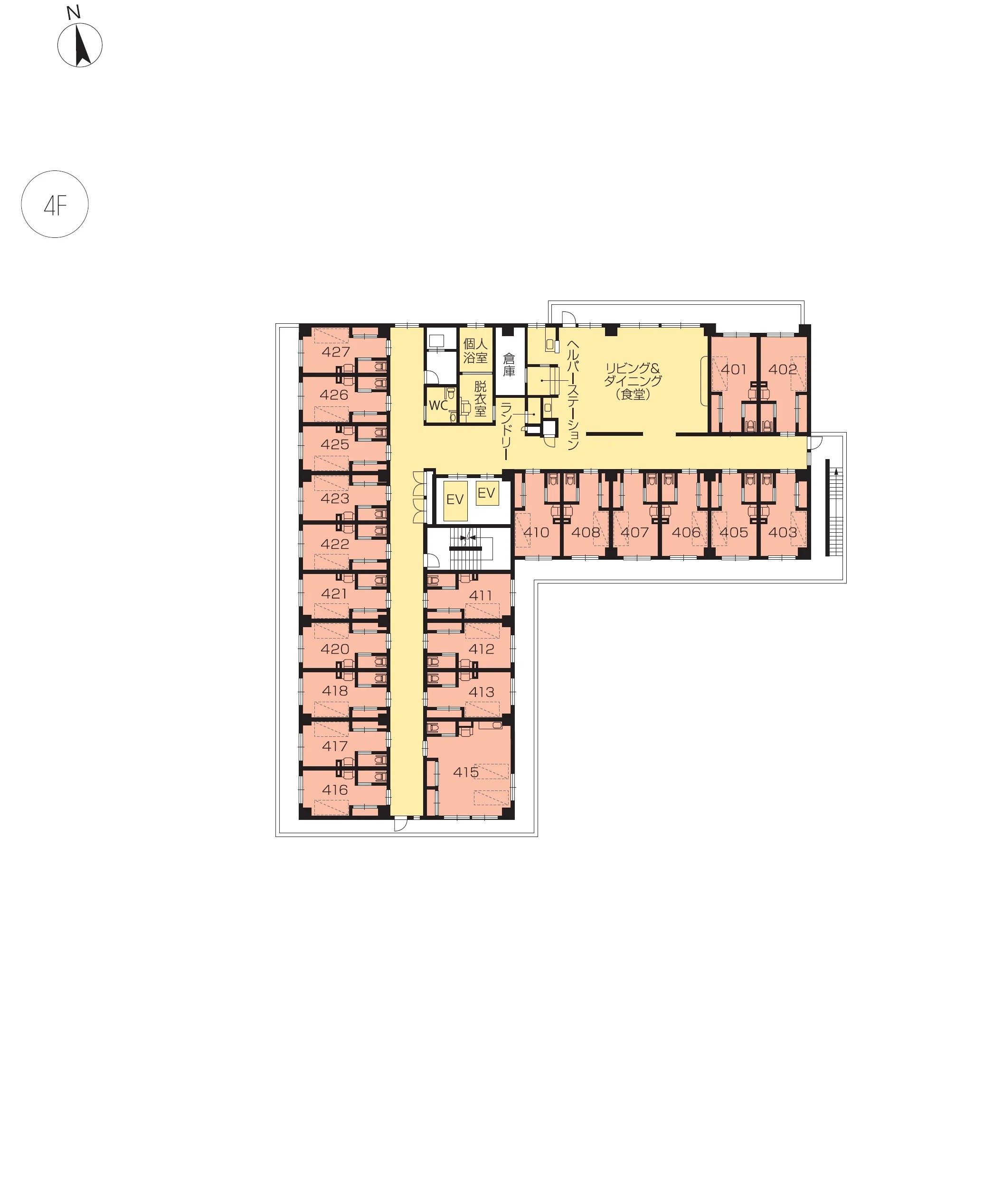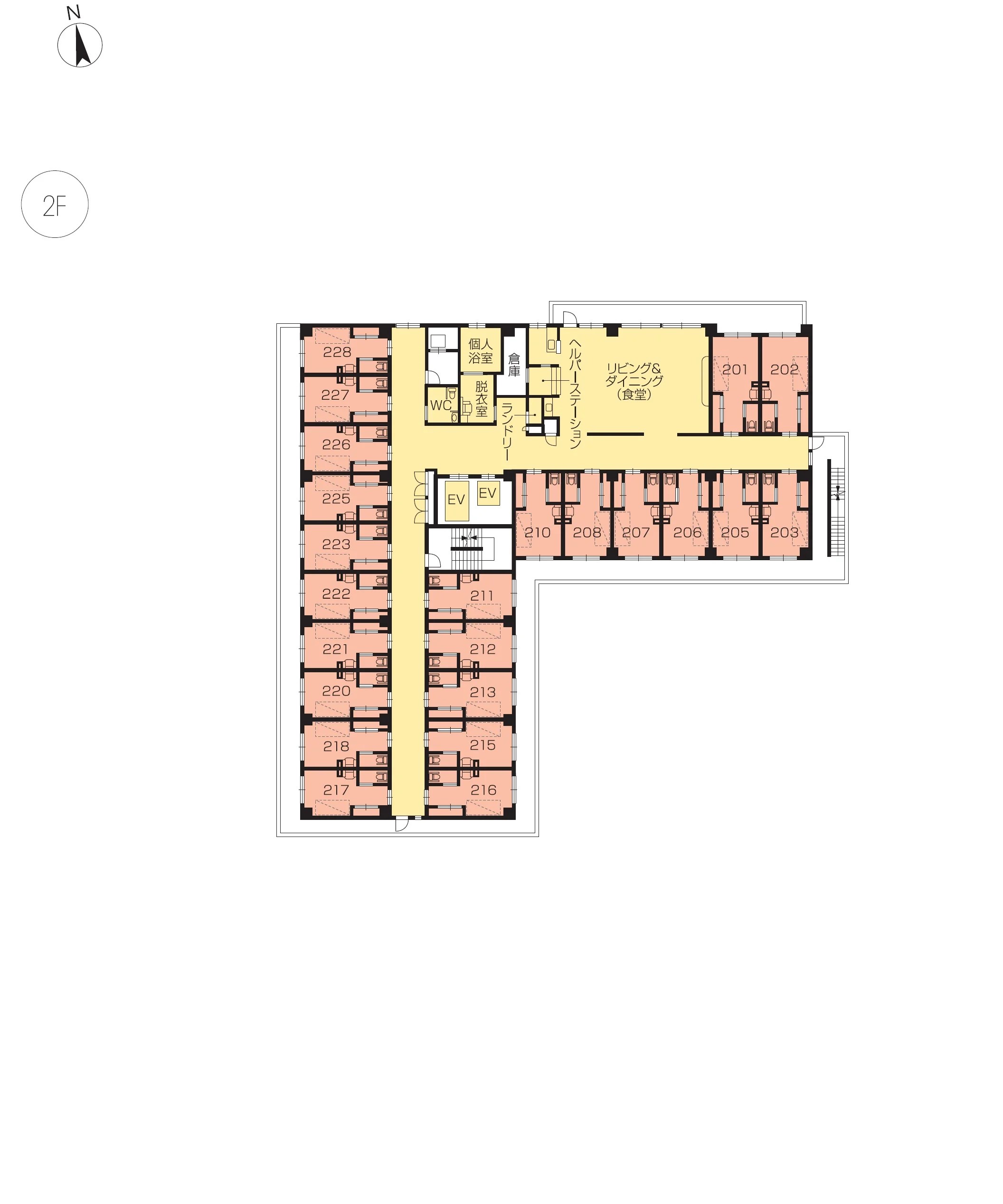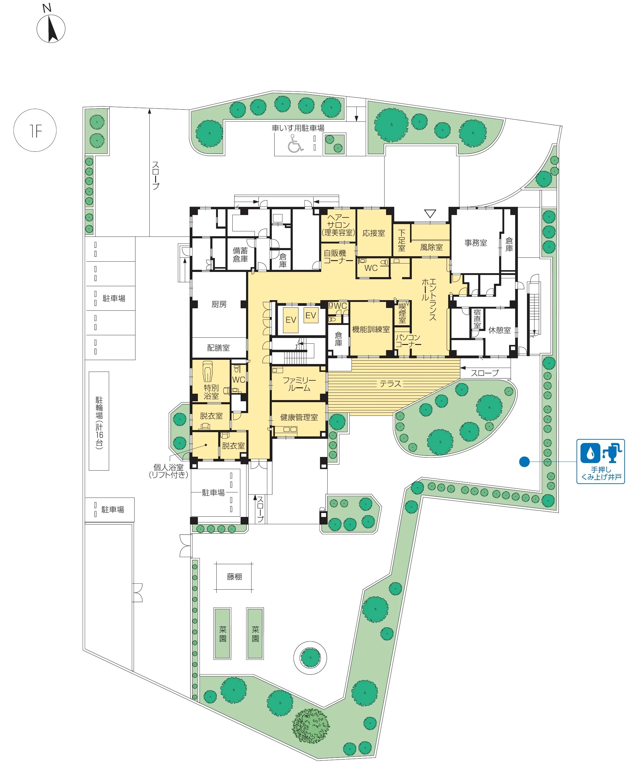 | 共用設備 | エントランスホール、リビング&ダイニング(食堂)、機能訓練室、個人浴室、特別浴室、ヘルパーステーション、健康管理室、応接室、ファミリールーム、パソコンコーナー、ヘアーサロン(理美容室)、ランドリー、喫煙室、駐車場 |