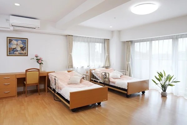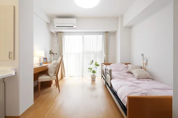 | 居室設備 | 介護用電動ベッド(寝具付)、ナースコール、車いす対応洗面台、温水洗浄機能付トイレ、チェスト、クローゼット、デスク、メモリーボックス、カーテン(レース・ドレープ)、エアコン |
