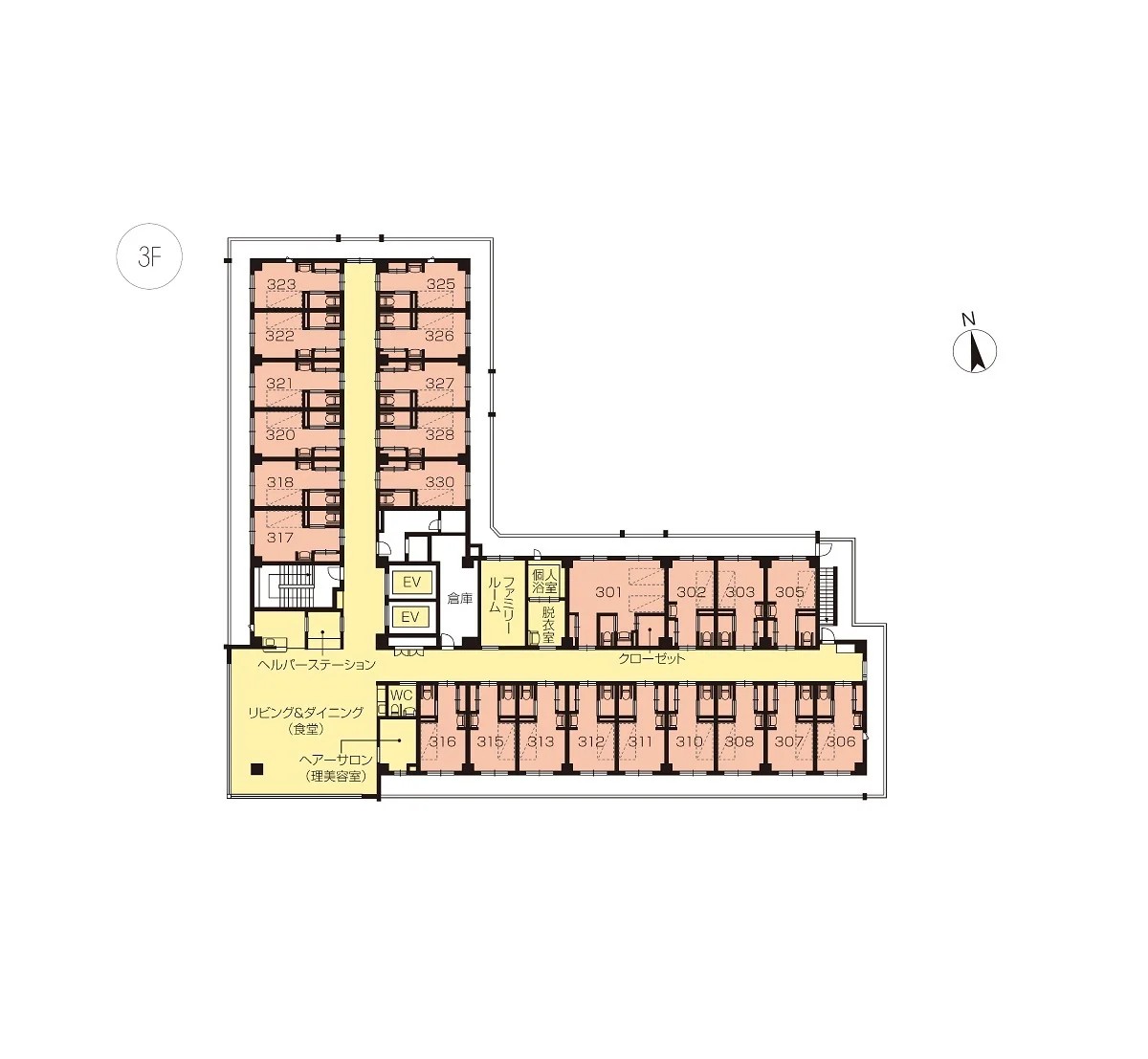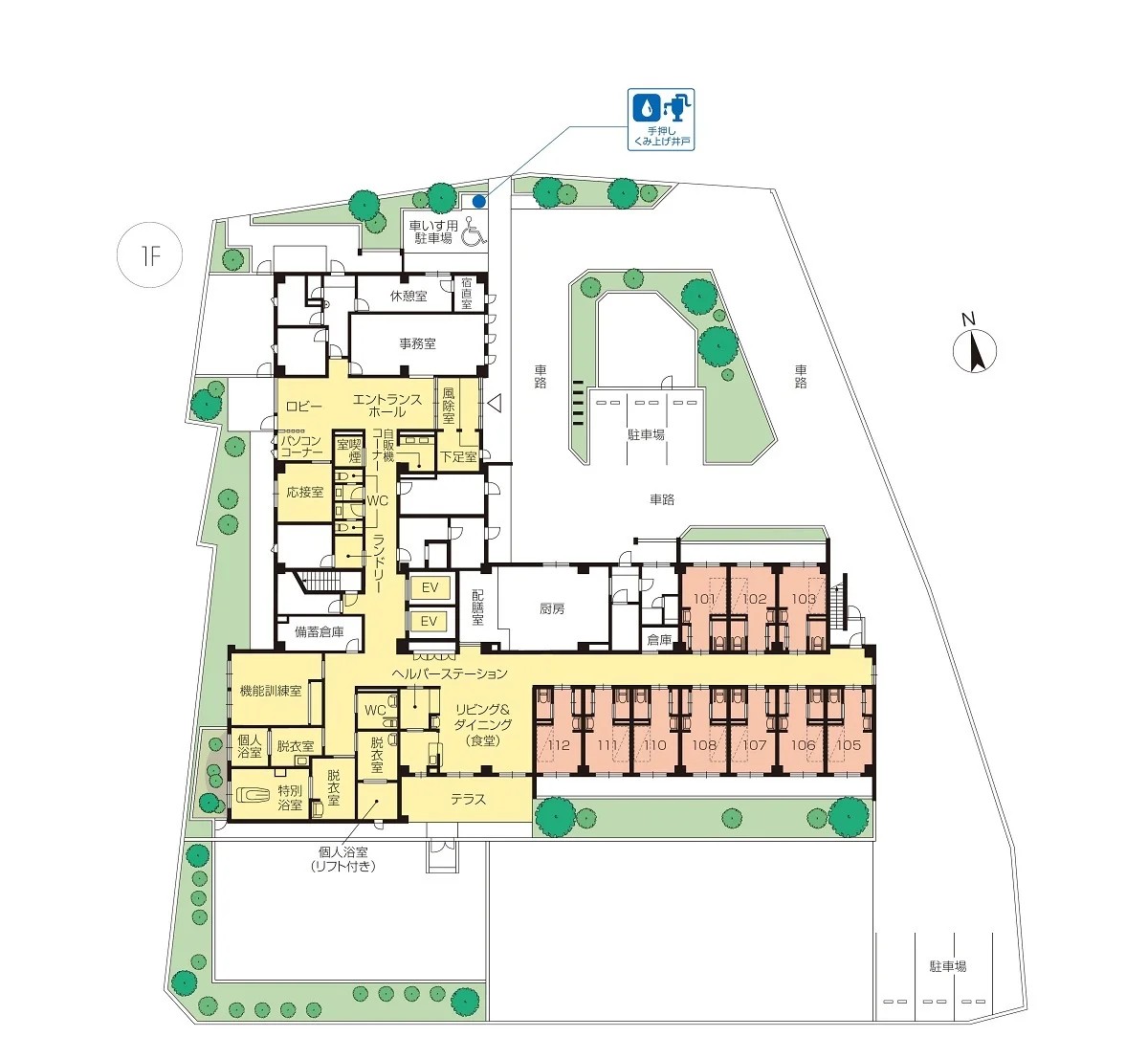| 共用設備 | エントランスホール、リビング&ダイニング(食堂)、機能訓練室、個人浴室、特別浴室、ヘルパーステーション、健康管理室、応接室、ファミリールーム、パソコンコーナー、ヘアーサロン(理美容室)、ランドリー、喫煙室、駐車場 |