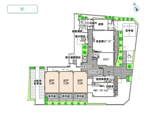 | 共用設備 | エントランスホール、リビング&ダイニング(食堂)、ラウンジ、フロント事務室、駐車場、駐輪場、トランクボックス |