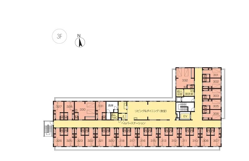 | 共用設備 | エントランスホール、リビング&ダイニング(食堂)、個人浴室、特別浴室、ヘルパーステーション、健康管理室、応接室、ファミリールーム、ヘアーサロン(理美容室)、ランドリー、喫煙室、テラス、駐車場 |