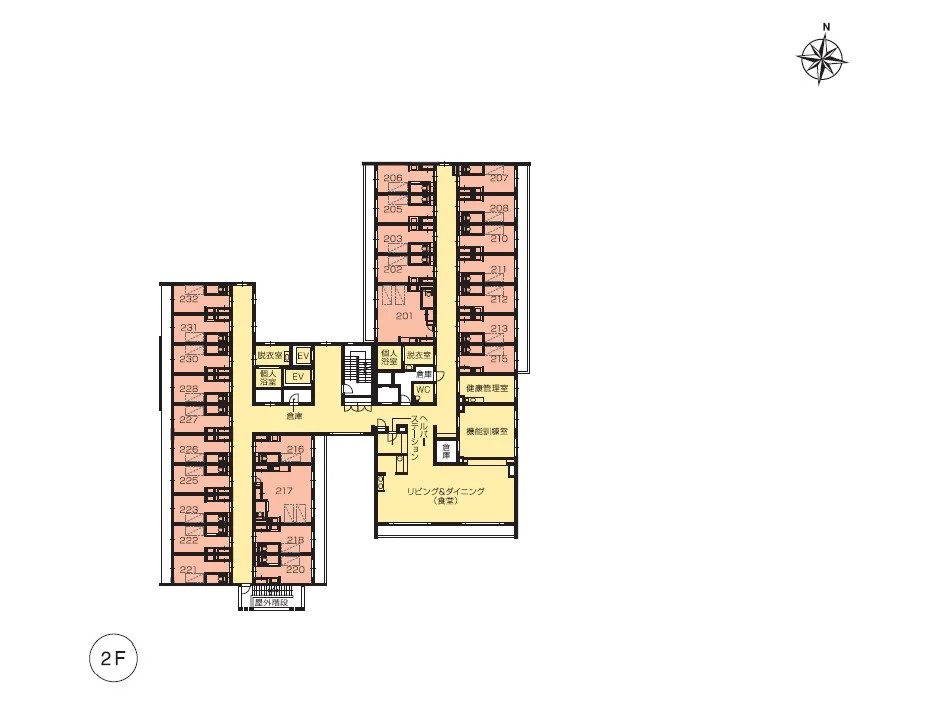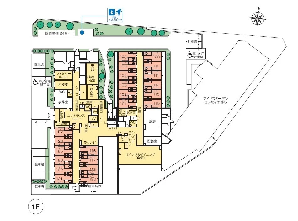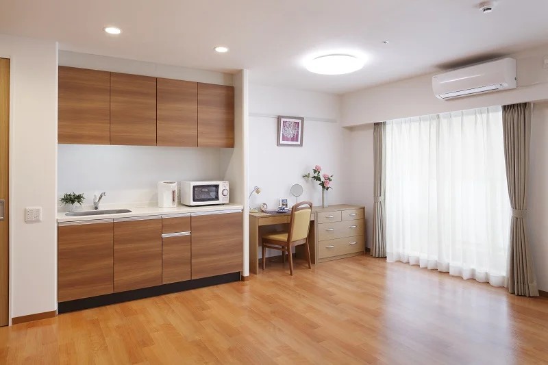 | 共用設備 | エントランスホール、リビング&ダイニング(食堂)、機能訓練室、個人浴室、特別浴室、ヘルパーステーション、健康管理室、応接室、ファミリールーム、ヘアーサロン(理美容室)、ランドリー、喫煙室、駐車場 |