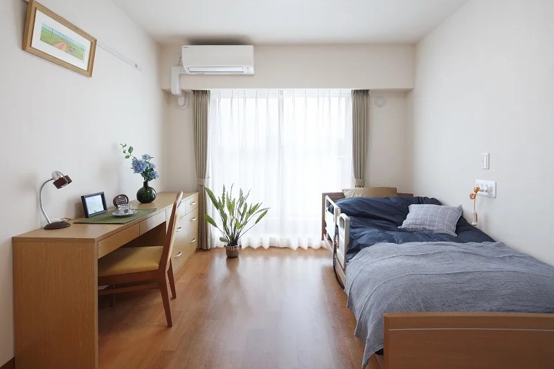 | 居室設備 | 介護用電動ベッド(寝具付)、ナースコール、車いす対応洗面台、温水洗浄機能付トイレ、チェスト、クローゼット、デスク、メモリーボックス、カーテン(レース・ドレープ)、エアコン |