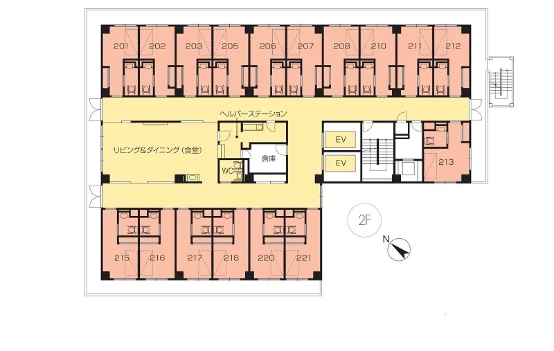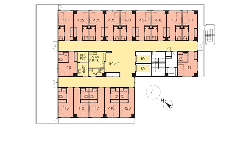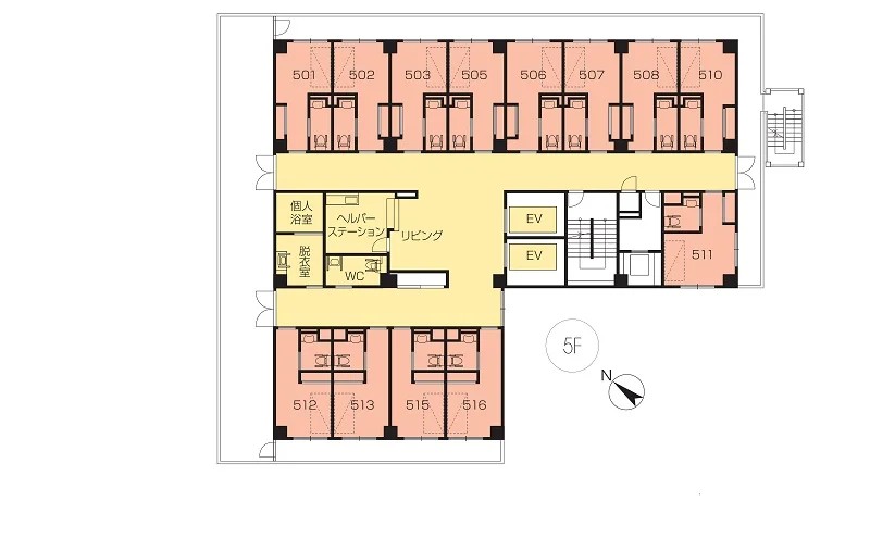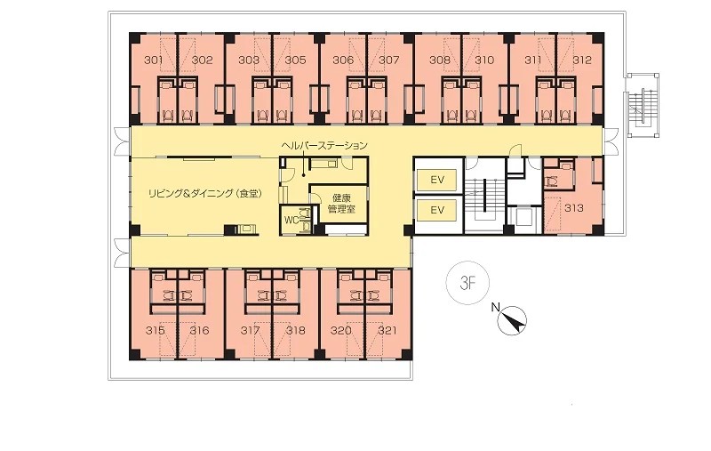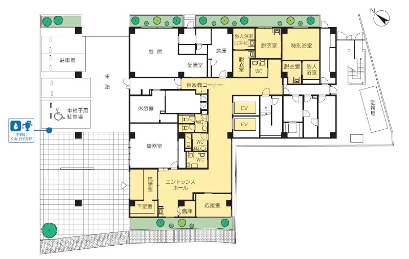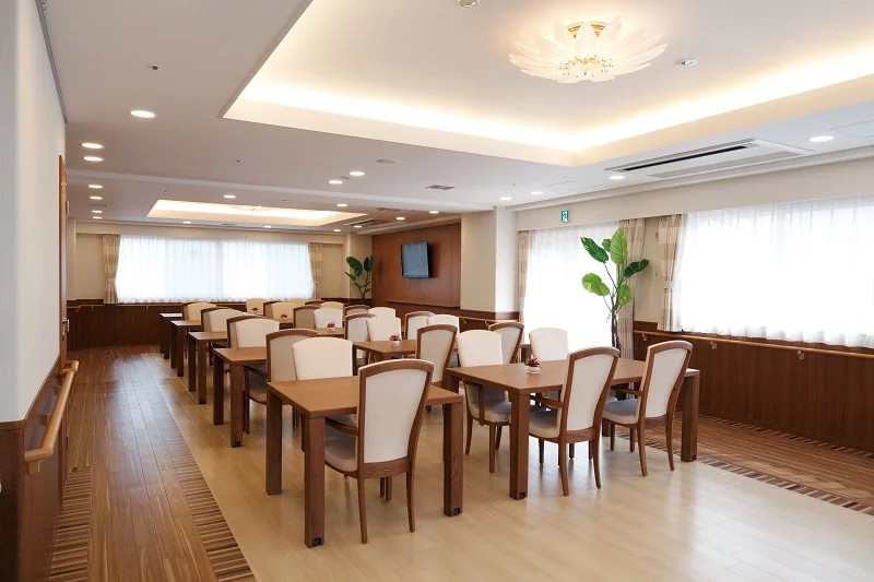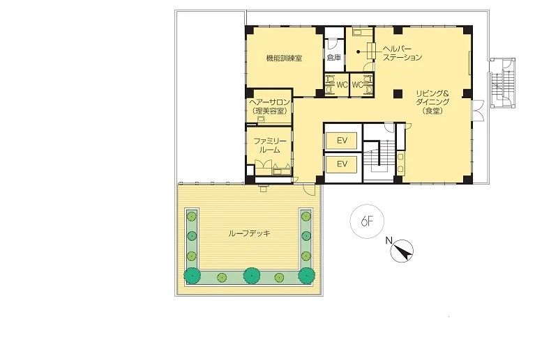 | 共用設備 | エントランスホール、リビング&ダイニング(食堂)※、機能訓練室※、ヘルパーステーション、健康管理室、特別浴室、個人浴室、ヘアーサロン(理美容室)、応接室、ファミリールーム、ルーフデッキ、化粧室、駐車場 ※食事だけでなくイベント・レクリエーション等、日常生活上多目的に使用。 ※機能訓練だけでなく多目的に使用。 |