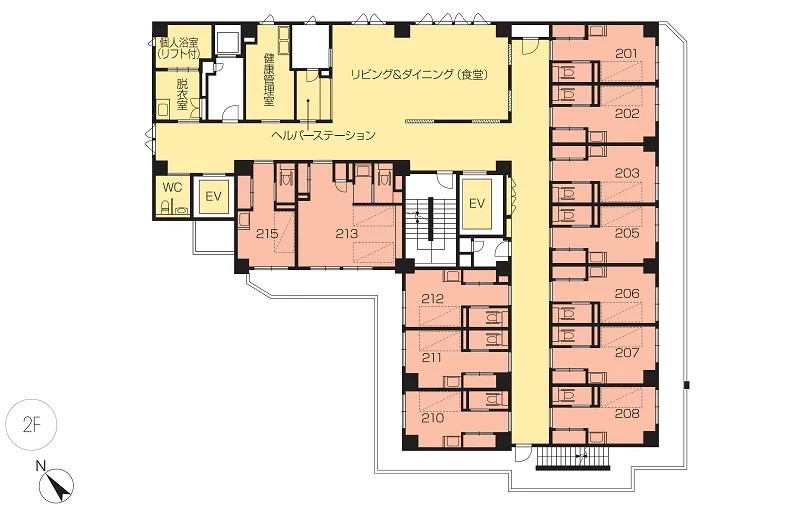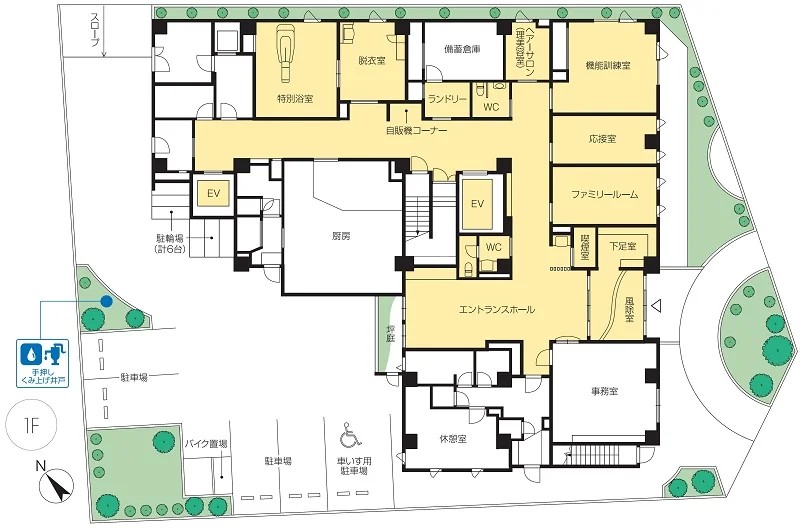 共用設備 | エントランスホール、リビング&ダイニング(食堂)、機能訓練室、個人浴室、特別浴室、ヘルパーステーション、健康管理室、応接室、ファミリールーム、ヘアーサロン(理美容室)、ランドリー、喫煙室、駐車場 |