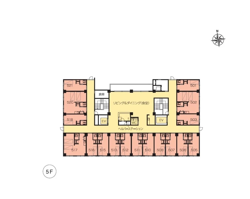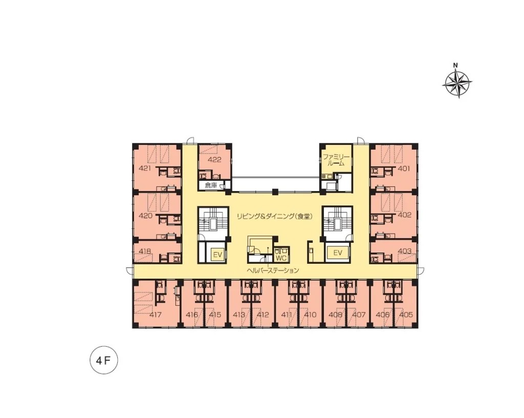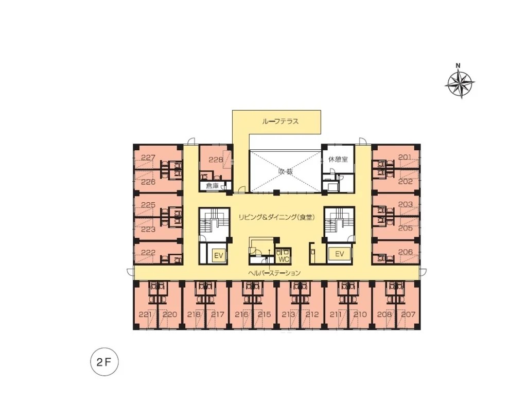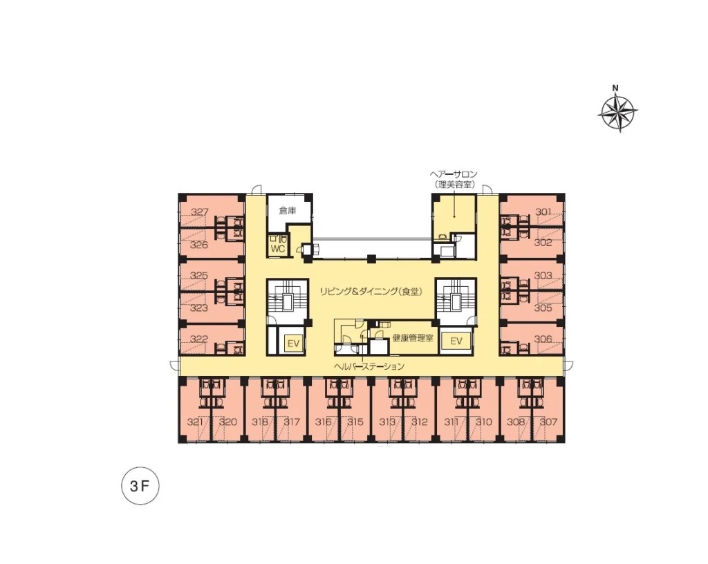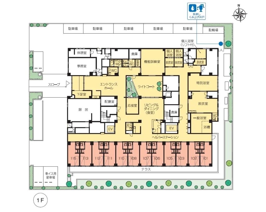 | 共用設備 | エントランスホール、リビング&ダイニング(食堂)※、機能訓練室※、ヘルパーステーション、健康管理室、一般浴室、特別浴室、個人浴室、ヘアーサロン(理美容室)、応接室、ファミリールーム、化粧室、喫煙室、ファミリールーム、ライトコート、駐車場 ※食事だけでなくイベント・レクリエーション等、日常生活上多目的に使用。 ※機能訓練だけでなく多目的に使用。 |