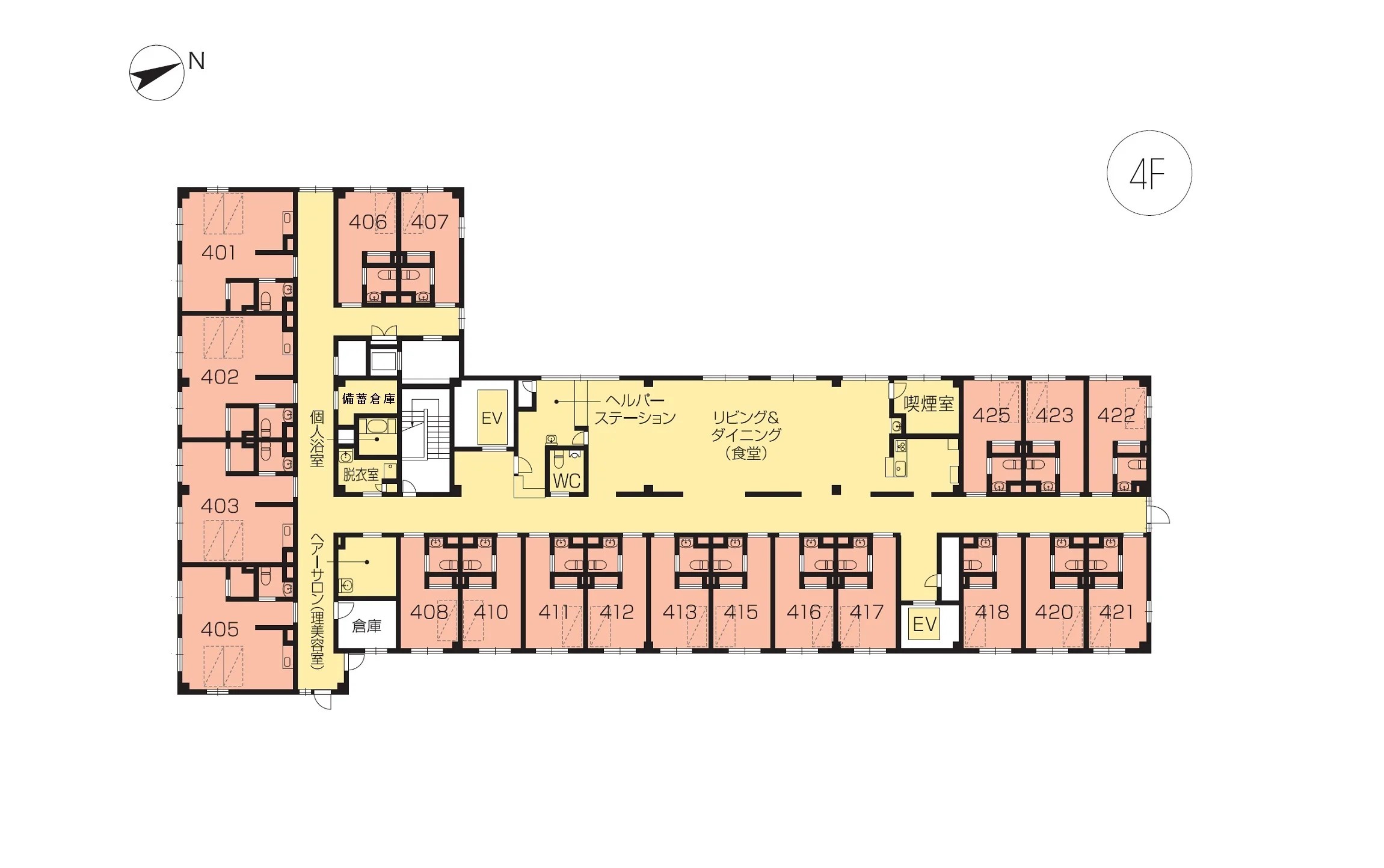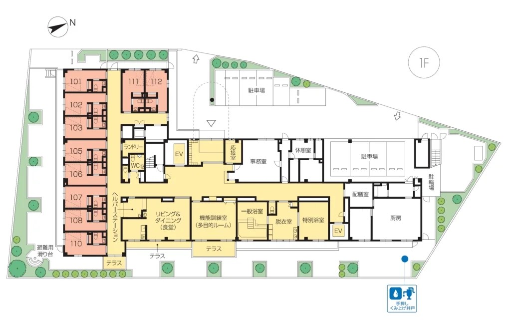 | 共用設備 | エントランスホール、リビング&ダイニング(食堂)※、多目的ルーム(機能訓練室)※、応接室、ヘルパーステーション、健康管理室、一般浴室、特別浴室、個人浴室、ヘアーサロン(理美容室)、ランドリー、化粧室、喫煙室、駐車場 ※食事だけでなくイベント・レクリエーション等、日常生活上多目的に使用。 ※機能訓練だけでなく多目的に使用。 |