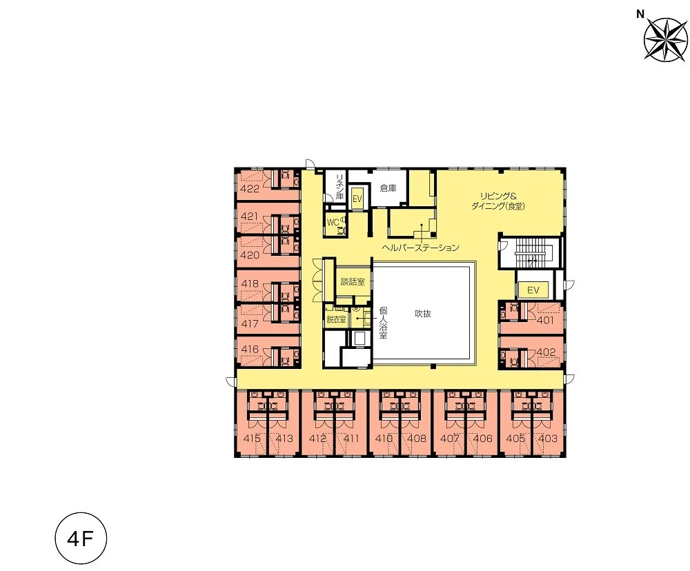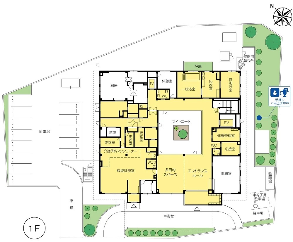 | 共用設備 | エントランスホール、リビング&ダイニング(食堂)※、多目的ルーム(機能訓練室)、談話室、応接室、ヘルパーステーション、健康管理室、一般浴室、特別浴室、個人浴室、ライトコート、ヘアーサロン(理美容室)、ランドリー、化粧室、喫煙室、駐車場 ※食事だけでなくイベント・レクリエーション等、日常生活上多目的に使用。 |