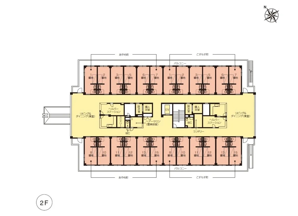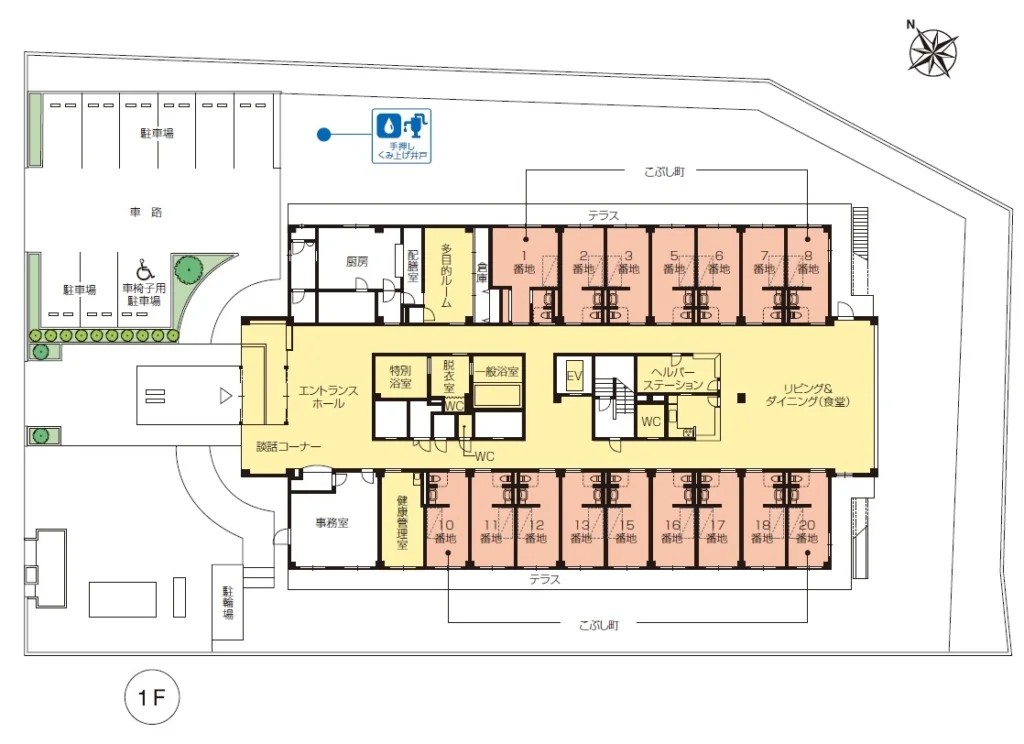 | 共用設備 | エントランスホール、リビング&ダイニング(食堂)※、多目的ルーム、ヘルパーステーション、健康管理室、一般浴室、特別浴室、個人浴室、屋上テラスガーデン、ヘアーサロン(理美容室)、ランドリー、化粧室、駐車場 ※食事だけでなくイベント・レクリエーション・機能訓練等、日常生活上多目的に使用。 |
