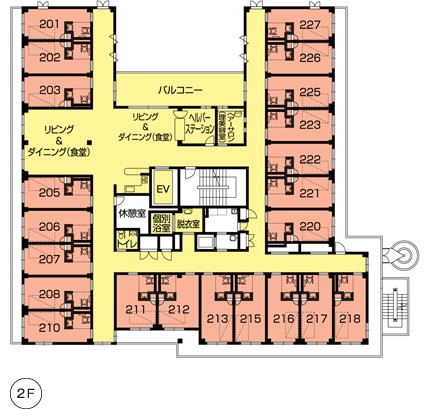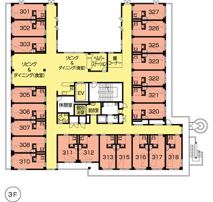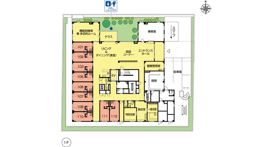 | 共用設備 | エントランスホール、リビング&ダイニング(食堂)※、多目的ルーム(機能訓練室)※、談話コーナー、ヘルパーステーション、健康管理室、一般浴室、特別浴室、個人浴室、屋上テラスガーデン、ヘアーサロン(理美容室)、ランドリー、化粧室、駐車場 ※食事だけでなくイベント・レクリエーション等、日常生活上多目的に使用。 ※機能訓練だけでなく多目的に使用。 |