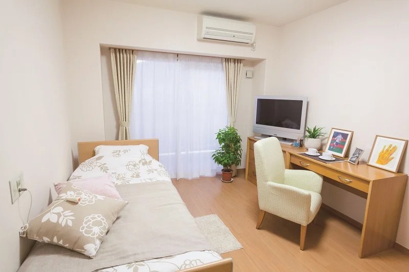 | 居室設備 | 介護用電動ベッド(寝具付)、ナースコール、車いす対応洗面台、温水洗浄機能付トイレ、チェスト、クローゼット、デスク、メモリーボックス、カーテン(レース・ドレープ)、エアコン |